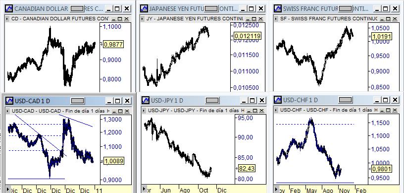 Por ejemplo en esta imagen se ven los futuros en CME del Dolar Canadiense, Yen y Franco Suizo, y sus correspondientes representaciónes habituales en Forex. Es obvio que ahí la interpretación de cualquier figura es simétrica. No imaginaba que esto pudiera ser motivo de debate.