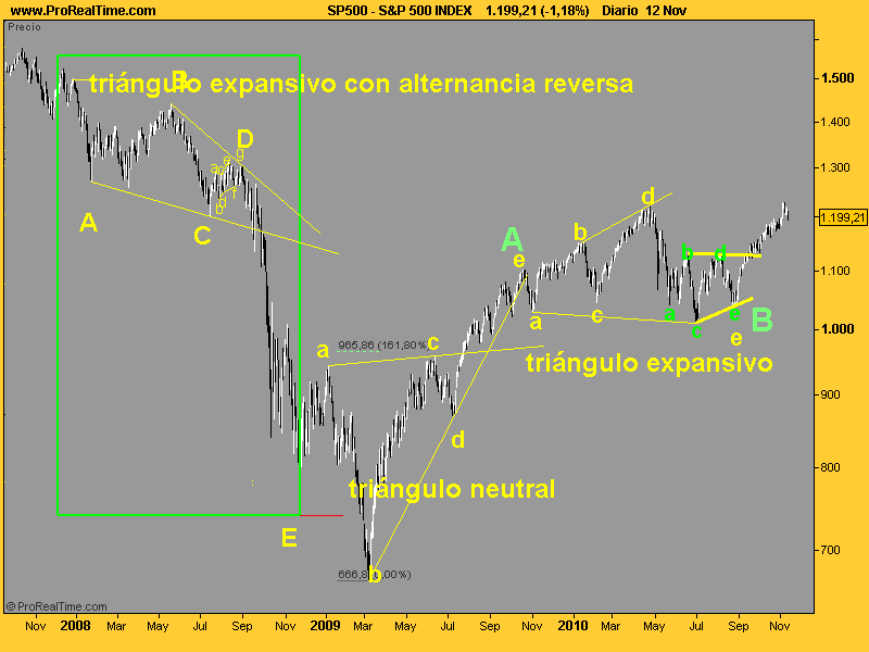 Ej de triángulo expansivo sería la caidita de Roma...tiene alternancia reversa y canaliza al vesre. Desde el final (que no el mínimo) comienza una pauta alcista por lo tanto ya que el triángulo primero es bajista. Un triángulo neutral (onda c la más larga y onda a no es violenta como en los otros triángulos) Después viene una pauta bajista: otro triángulo expansivo, cuya onda e es un triángulo contracto. Y desde agosto estamos desarrollando otro patrón alcista ¿cuál? Pos vaya usté a saber