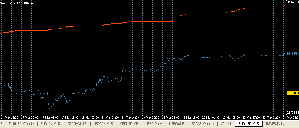 Esa operativa la conozco, requiere menos atención que la que yo practico y se que hay mucha gente que habla bien de ella aunque personálmente nunca la he testeado.Gamelu escribió:Buenas spirit, felicidades por el sistema, y sobre todo gracias por compartir esta informacion con el resto. Hace tiempo que practico una operativa con hedgind , la conoci en el foro de forex hermano a este, operativa en la que abres 4 posiciones simultaneamente, hedge de eur /usd y hedge de gbp/usd , la diferencia es que a la hora de cerrar posiciones se hace por parejas, coges por ejemplo el long eur/usd y short gbp/usd, de da una ganancia de +40 pips por ejemplo, luego se trata de cerrar la otra pareja con una perdida inferior, los DD suelen ser bajos, ya que haces covertura con el otro par. El doble de comisiones, pero como la opero en marketiva que no cobra nocturnidad ni por hedge ni na, es rentable, mantengo las posiciones sin ninguna prisa de cierre.