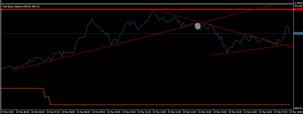 Hoy ha sido un día terrible para el sistema, se han quedado enganchadas el 100% de las buys en la bajada, increible, pero cierto, el 100%, lo que parece imposible resulta que de cuando en cuando ocurre y es que la bajada del eur/usd ha sido "guarra-guarra", tirándose todo el día amagando con aguantar el soporte, sin romper cláramente y dejando ahora la pelota a los asiáticos a ver como amanecemos mañana.