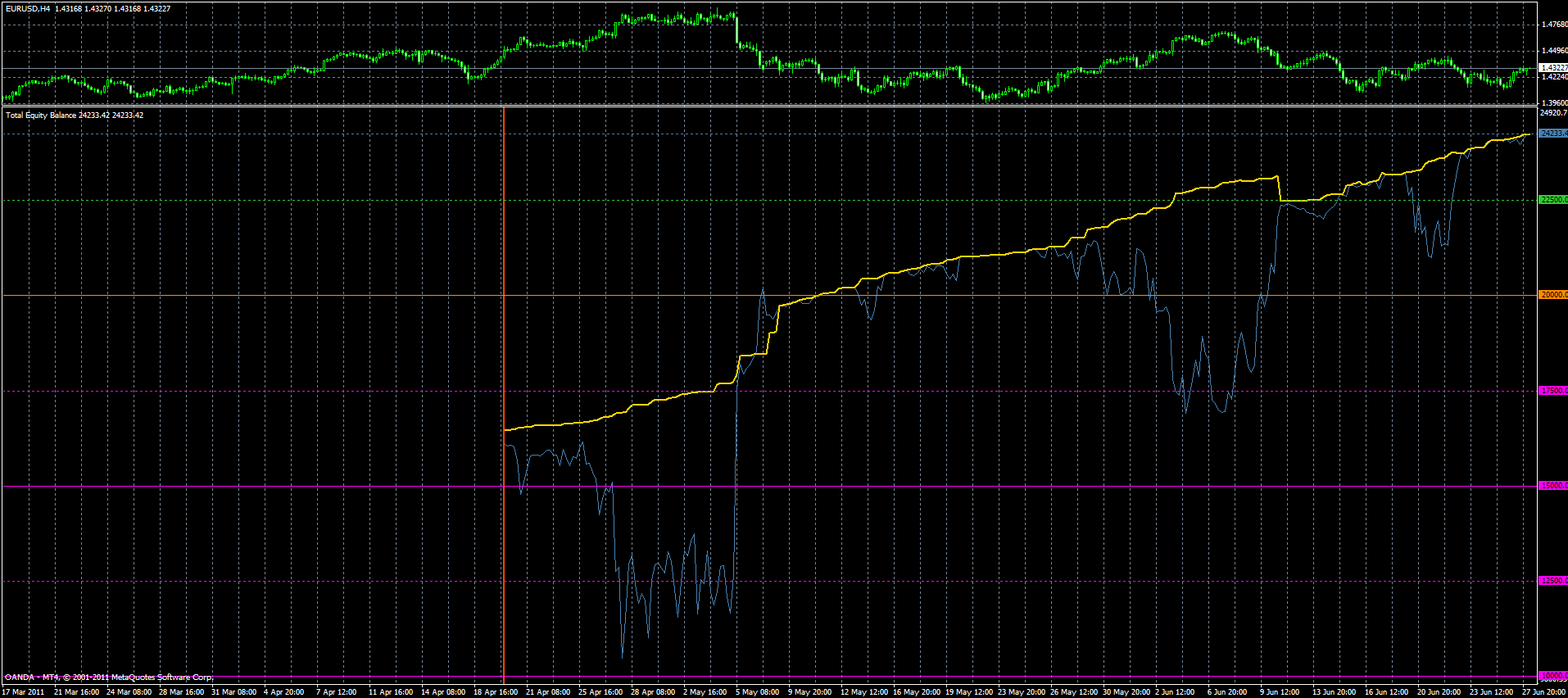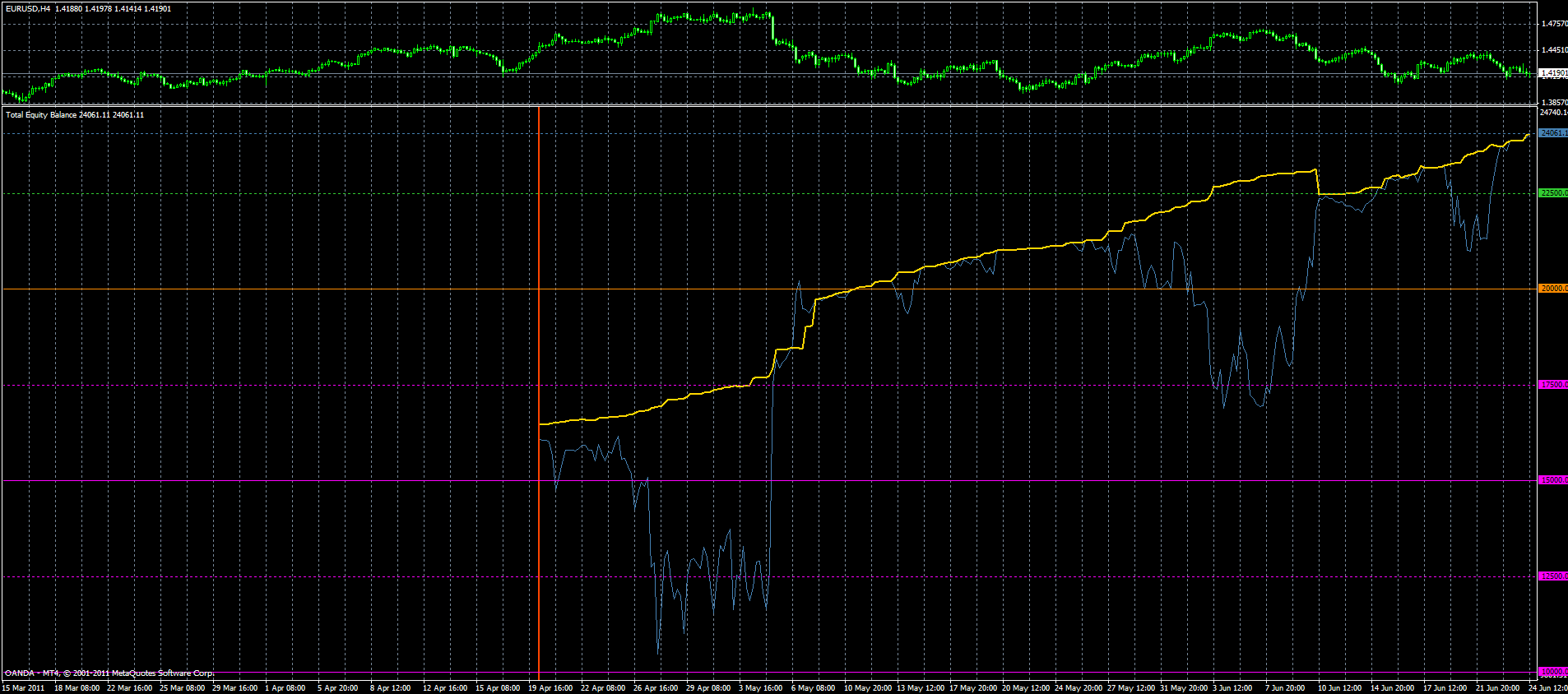 A mediados de Abril de 2011, el broker con el que estábamos realizando las pruebas canceló las 4 cuentas demo. Tras comprobar que era imposible que las restablecieran decidimos abrir una cuenta en Oanda con la équity que tenía la peor de las cuentas en el momento de ser canceladas (16.450€).