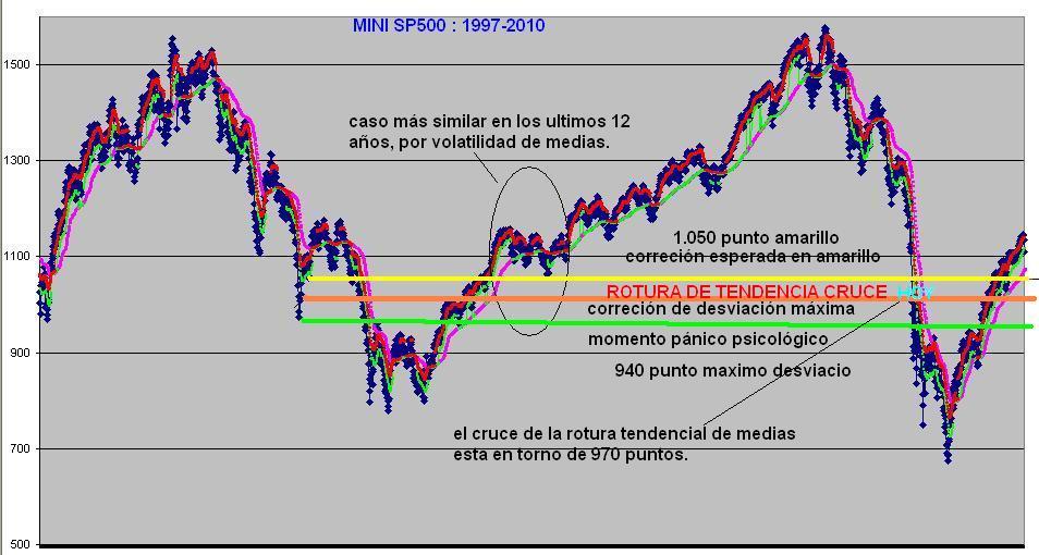 Siguiendo con la exposición bajo mi punto de vista acertada de rubens, y cogiendo como modelo el Trend Agma 7, no vemos todavía ninguna clase de rotura de tendencia alcista, pero con diagnostico a cambio de tendencia a largo plazo. He cogido como referencia en los ultimos doce años una subida mas o menos similar y la volatilidad de las medias, para buscar puntos de semejanza con el momento actual y ver donde pueden llegar el retroceso correcitvo, el máximo correctivo y el cruce a dia de hoy que cambiaria la tendencia a largo plazo.