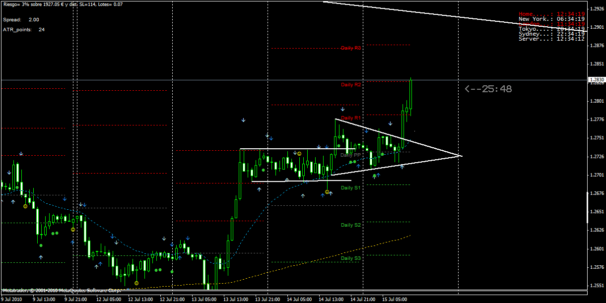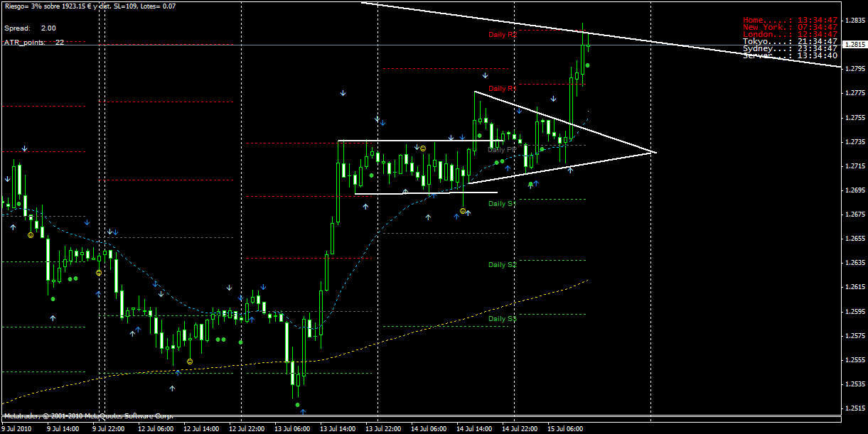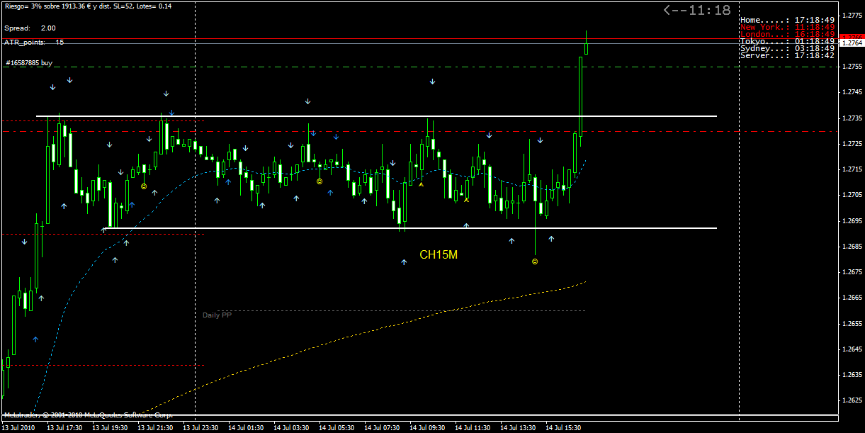 La ejecucion creo que se ha hecho bien unos 19 puntos por encima de la resistencia del canal. Si la resitencia estaba en 1.2736 aproximadamente, el stop de compra lo puse en 1.2755. No se si quizas la orden deberia haberla puesto mas baja o allí estaba bien. O tal vez debería haber metido la orden manualmente a pie de grafico y un stop ceñido por si se produce un falso rompimiento para tener una pequeña perdida. No se muy bien como se operan los rompimientos.