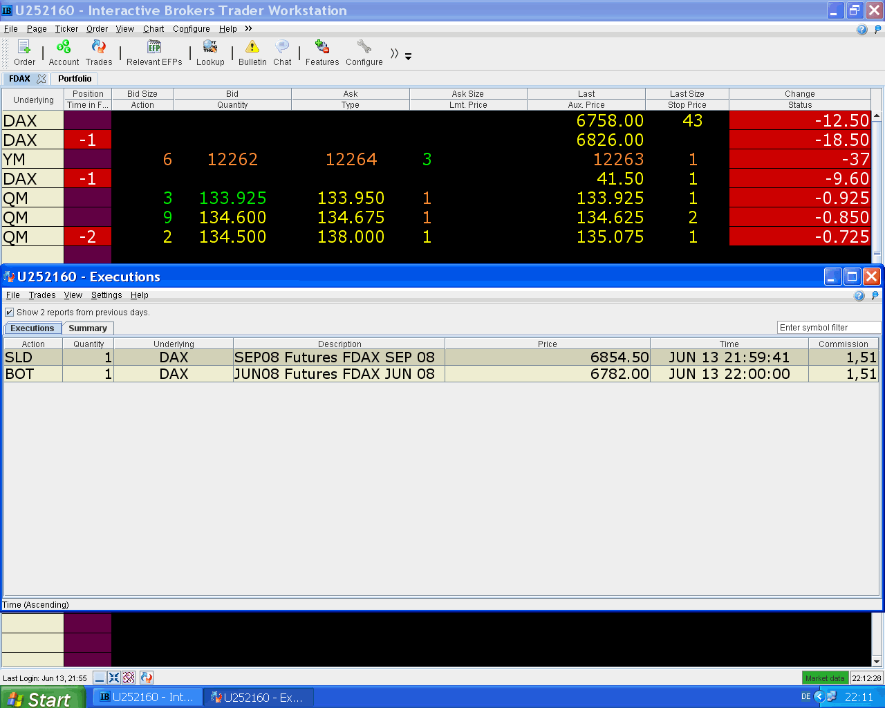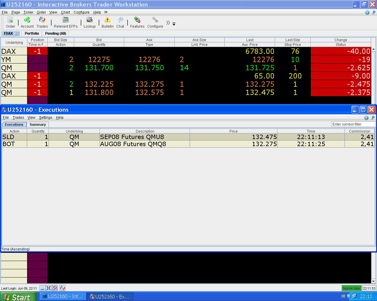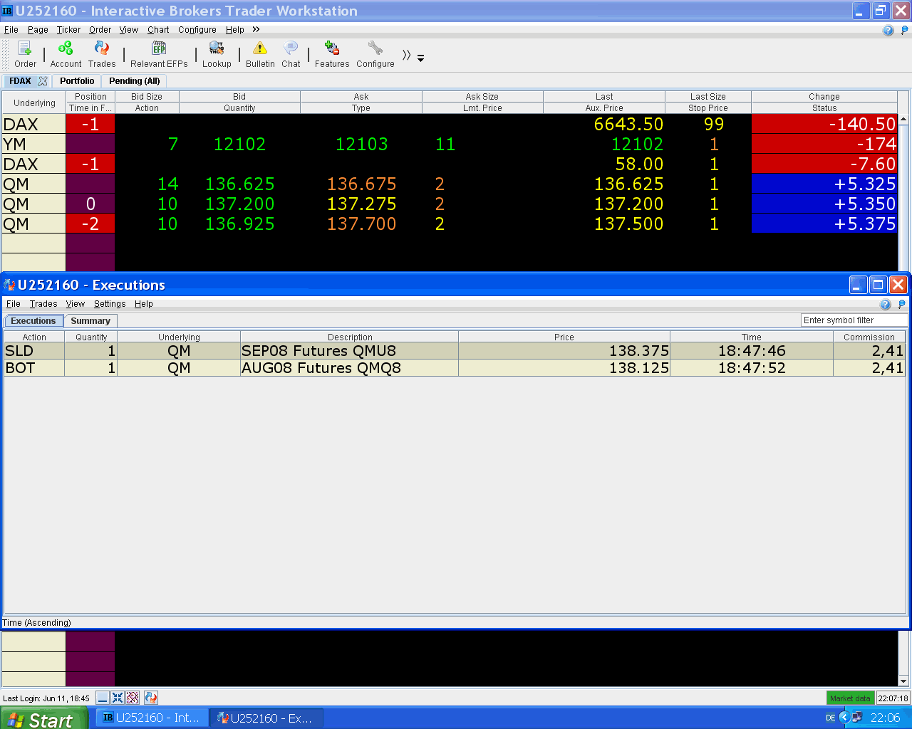 el lado positivo de la subida del petróleo es que mientras el precio esté alto no tengo que preocuparme por el DAX. El contrato de agosto que me quedaba lo cambié hace un rato también por uno de septiembre, ahora los dos que tengo son de ese vencimiento.