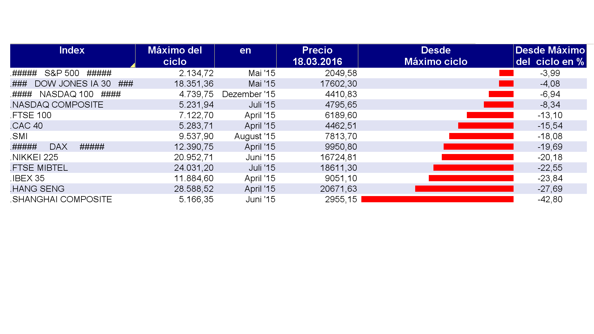 Pérdidas de los principales índices internacionales desde los máximos del ciclo:
