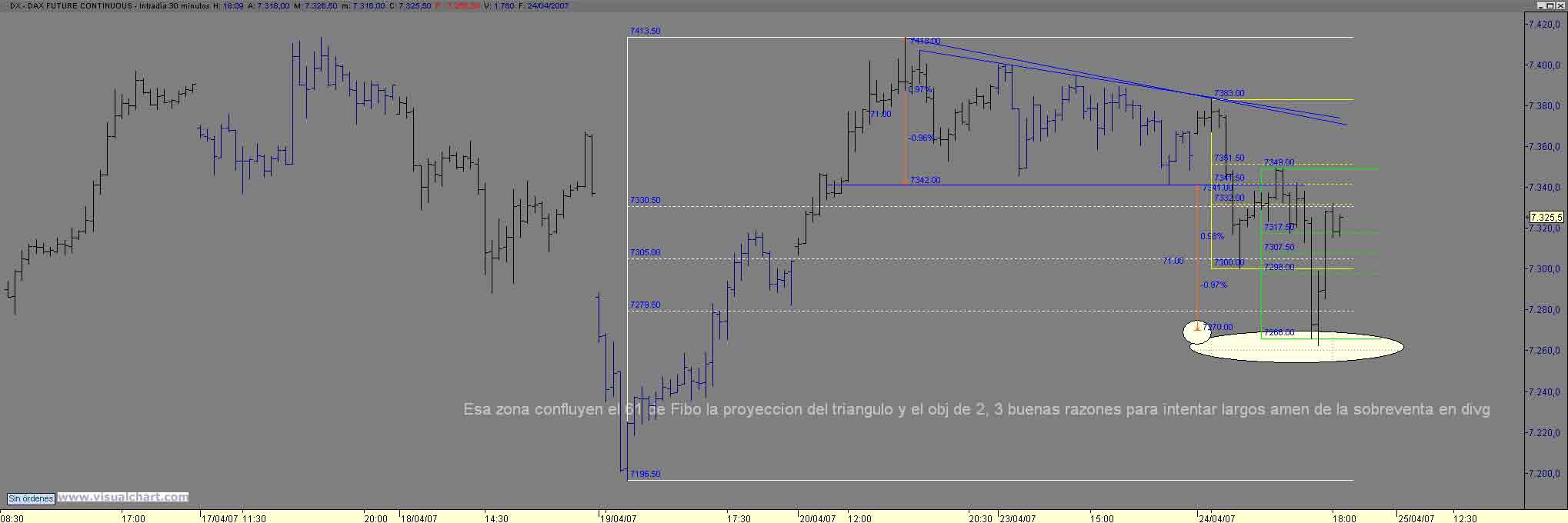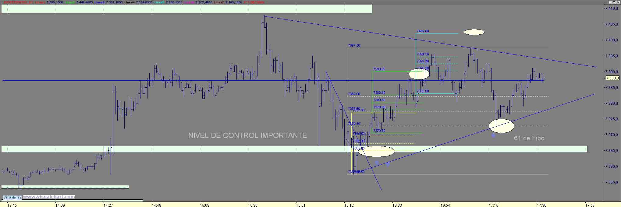 retro al 7395 y proyeccion de impulso bajista al 67 (claro nivel de control matinal) dilatacion al 58 rotura de la tendencia bajista previa retro al 7370 y proyeccion al 7390 (1) 7402 (2) no cumple el 2 pero retrocede justo al 61 de Fibo de todo ese movimiento (7357.50 7397.50) nuevamente largos en dos impulsos con obj 92.50 punto de resistencia de la bajista creada desde el 408