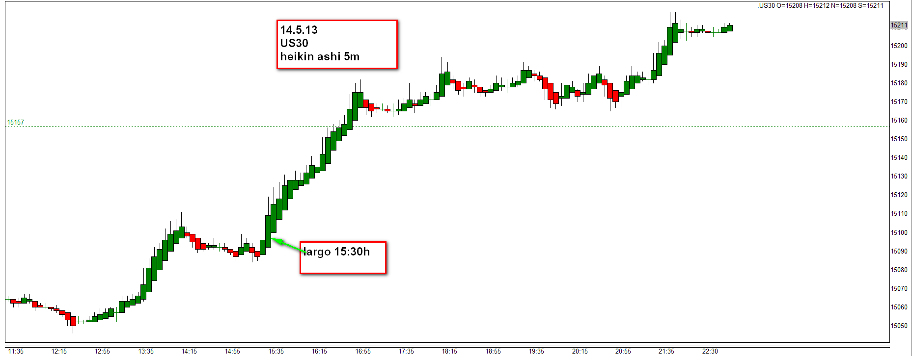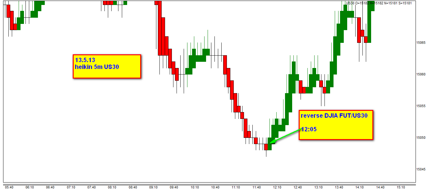 La vela senalada como reverse del DE30 empieza a la 12:15h y termina a las 12:30h. Aunque no parezca una vela potente por si mismo es sin embargo un perfecto pivot o morning star. Observad el grafico del USA . Las velas heikin ashi de5 minutos giran ya 10 minutos antes.