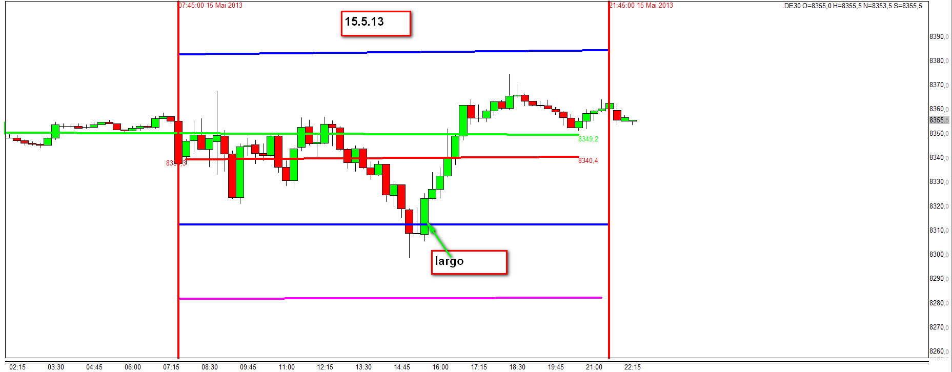 El dia 13.5.13 es decir ayer el precio bajo hasta la segunda zona larga y entramos largo segun las reglas: