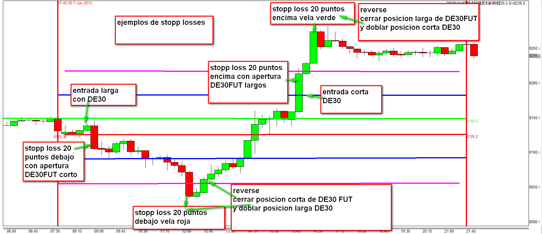 Como alternativa propongo un stop loss con DE30 contados y DE30 futuros con una distancia de 20 puntos incluido el spread para el DE30 futuro.
