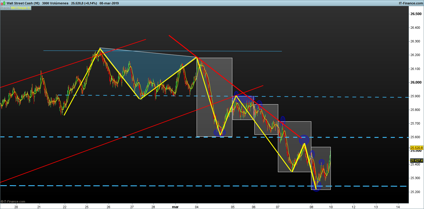 Gráfico del dow: tendencia bajista, ha hecho reversal y tiene cajas diarias con máximos mas bajos
