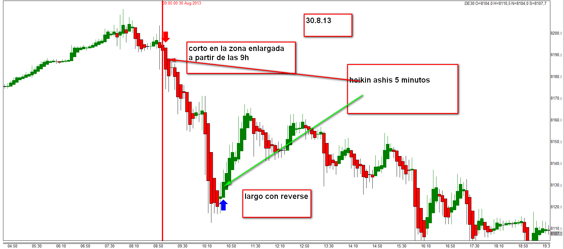 Trading con vela heikin ashi 5 minutos. En la zona enlargada cierre/apertura siempre con stop loss positivo de 20 puntos.