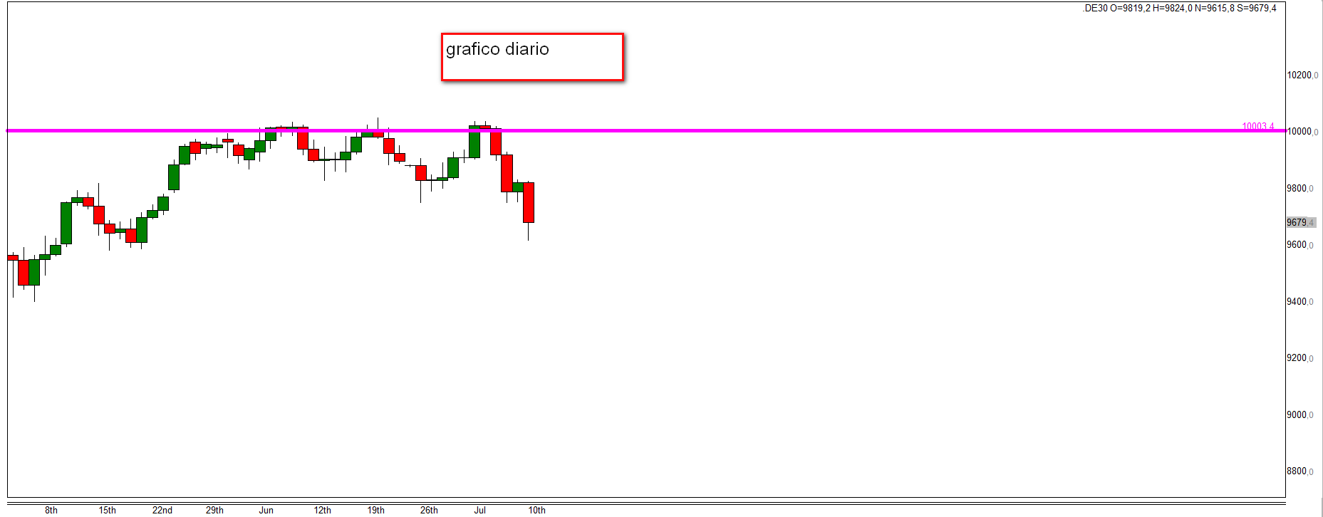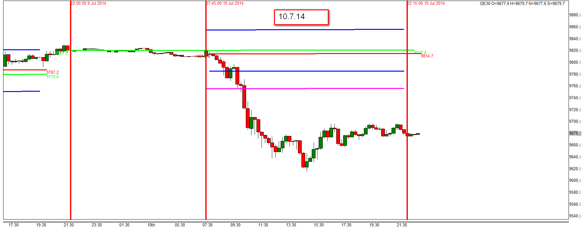 El dia de hoy se presentaba bastante negativo: Nikkei y los DJIA FUT negativos y consecuentemente la apertura debajo el cierre. El catalizador negativo eran los comentarios de la FED acerca el posible final del QE en octubre.. A partir de las nueve datos europeos negativos hicieron bajar el precio aun mas y a las 15:30h el DAX y los futuros del DOW cotizaban 170 puntos negativos. Solamente los buenos datos del empleo en USA hicieron subir parcialmente el precio del DAX.