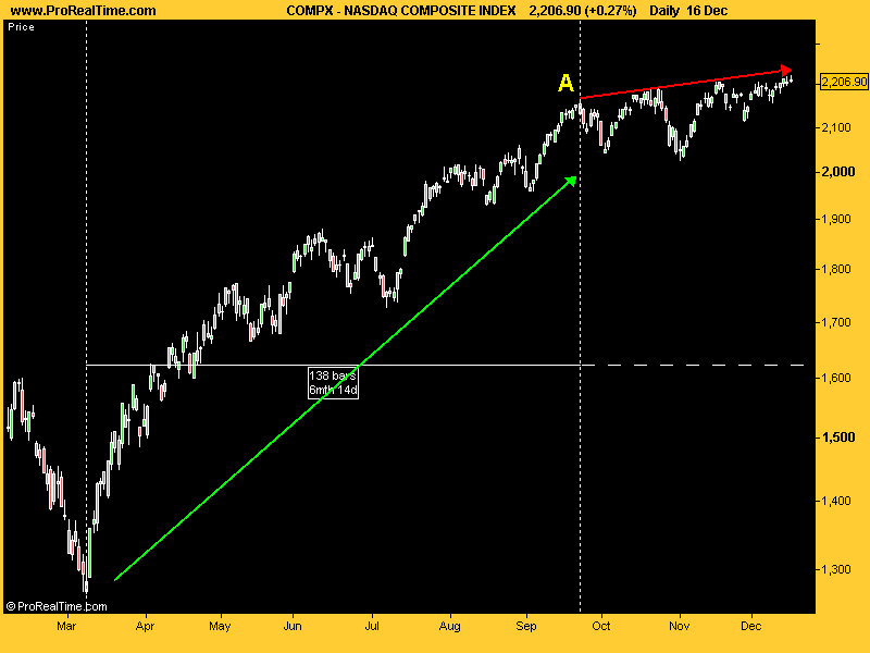 Cuando le gritaban al yonatan: Kiyoooooo baja pabajoooo...decían que era una redundancia y por tanto una incorrección...pero hete aquí que en el mundo bursátil conviene especificar porque a veces las cosas bajan parriba :lol: :lol: :lol: Eso es lo que observo en el gráfico del nasdaq: un movimiento hasta octubre de ascenso y desde entonces una corrección HACIA ARRIBA :shock: haciendo nuevos máximos...u sea, que los cortos pos como que no...se puede tirar de esta guisa lateral un rato largo perfectamente que este ascenso-descenso lateral puede ser más largo en tiempo que la subida perfectamente...y la subida duró 6 meses...pero luego subirá con más brío.