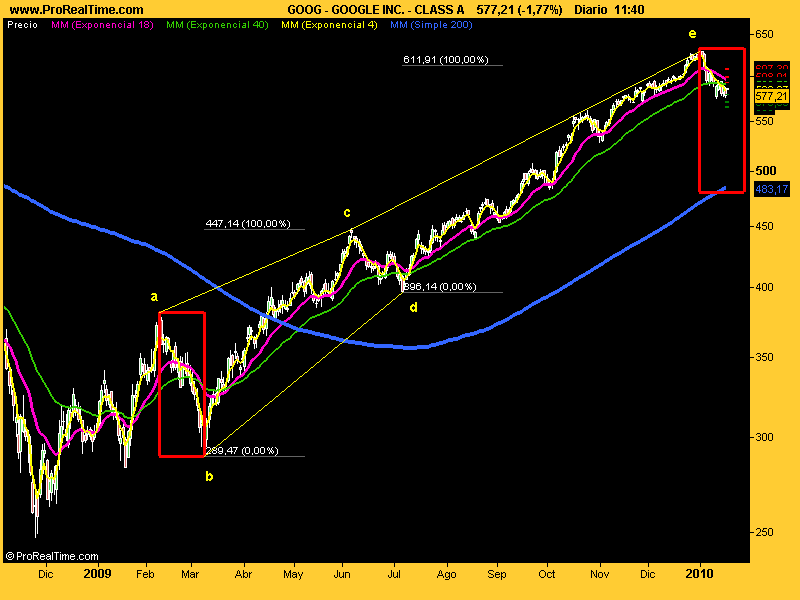 Pos después miraré otras cosas, pero el caso es que Google tiene pinta de haber iniciado una onda correctiva equiparable a las dos mayores de la subida. Podría ser de una intensidad similar a la que he etiquetado como B entre febrero y marzo de 2009.