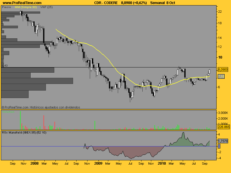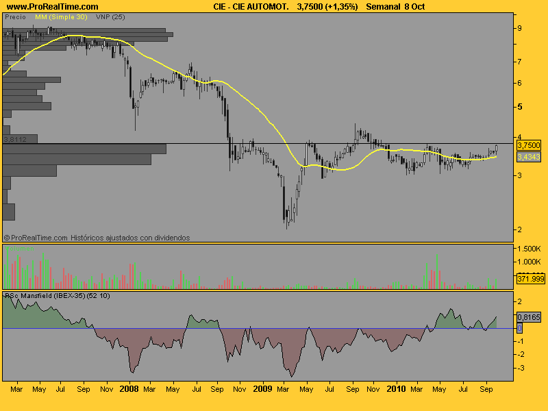 Y buenas expectativas: aumento considerable del volumen sin que el precio se mueva (habría que ver, pero sería significativo que el aumento se hubiera hecho en días malos para el ibex) y la fuerza relativa con respecto al índice con buena salud.