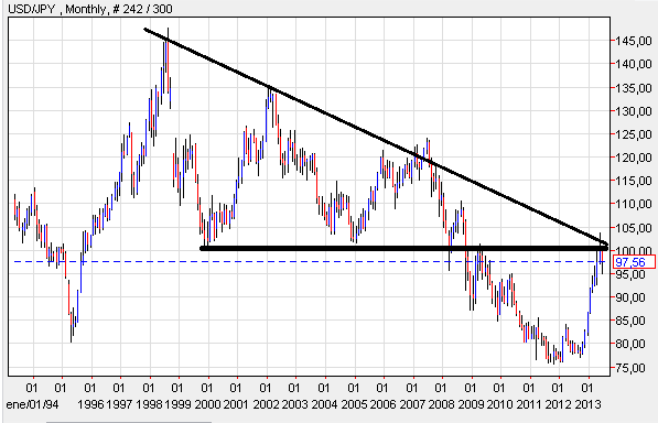Me encanta ese gráfico, si extrapolas el cambio DEM/JPY para obtener la relación con el Euro a largo plazo te sale lo mismo, cuidadín que lo mismo todo esto es un rebote dentro de la tendencia bajista. ¿O acaso alguien se cree que Japón vaya a crecer gracias al Abenomics? No sé yo...