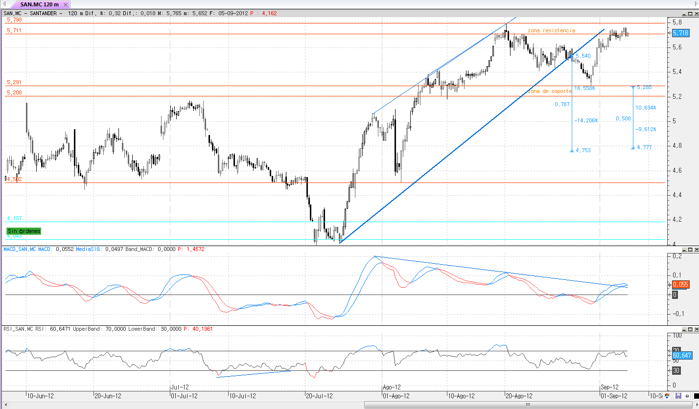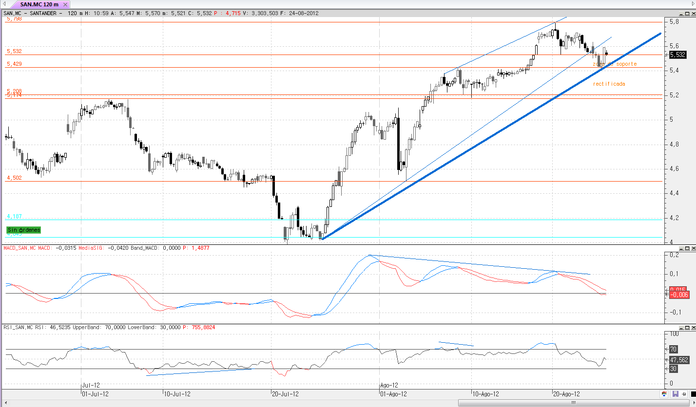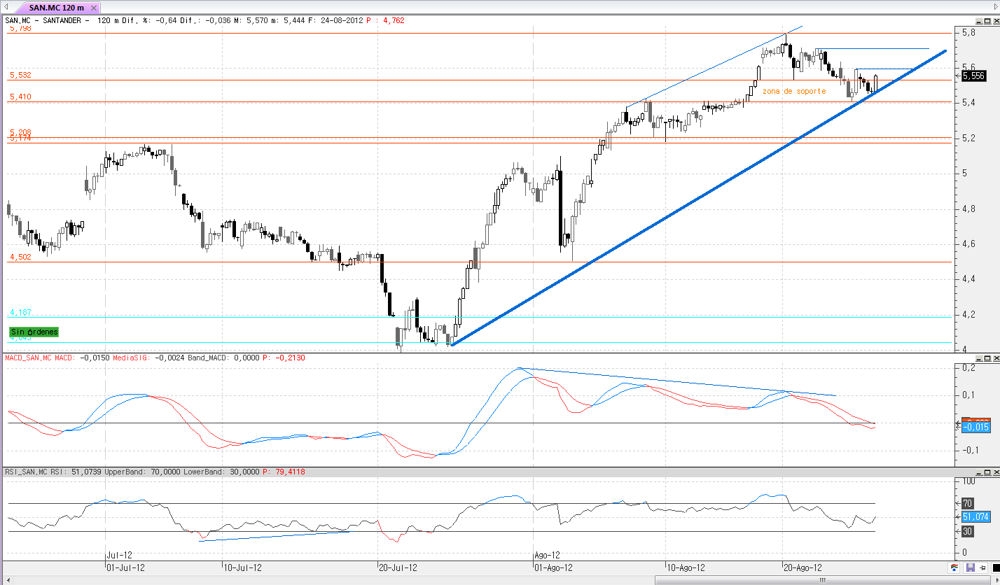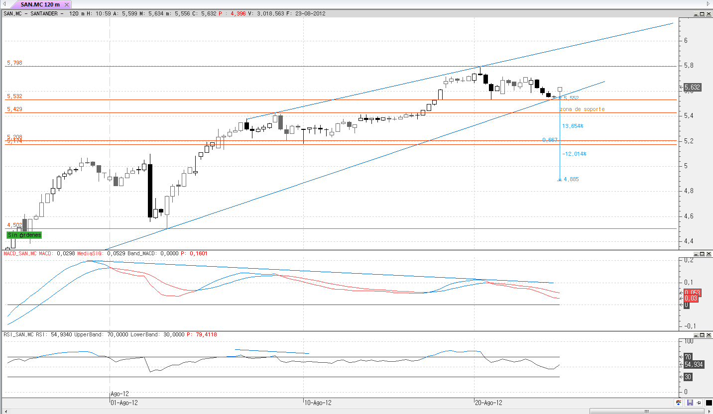 En cuanto al gráfico se puede observar que los indicadores se están relajando, la zona de soporte marcada funcionó perfectamente, la vela realizada en diario es esperanzadora así como el grupo de velas en 120m, todo ello me hace rectificar la línea de tendencia alcista a otra con base en el mínimo de ayer y que pasa hoy por 5.44 aproximadamente; no deberíamos descartar el inicio de un movimiento lateral entre 5.80-5.40.