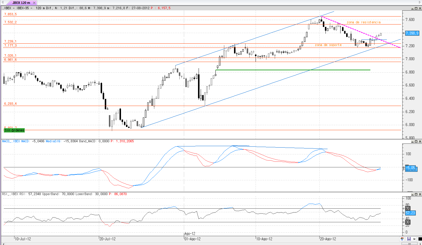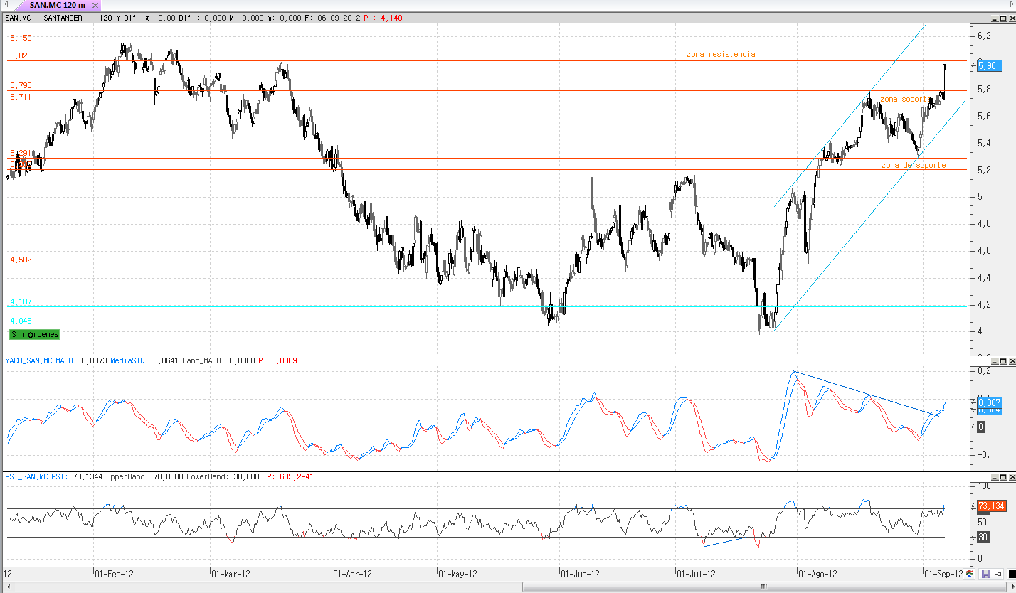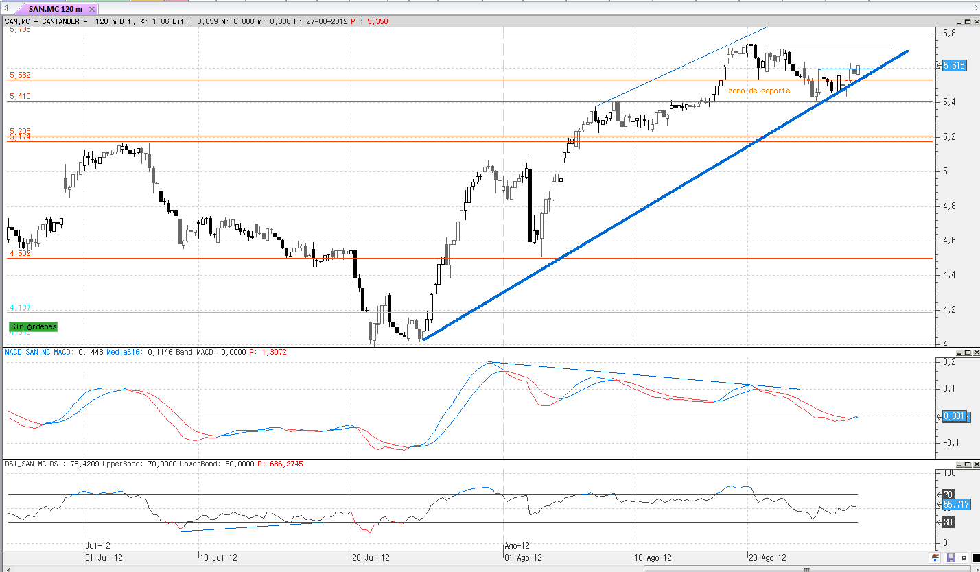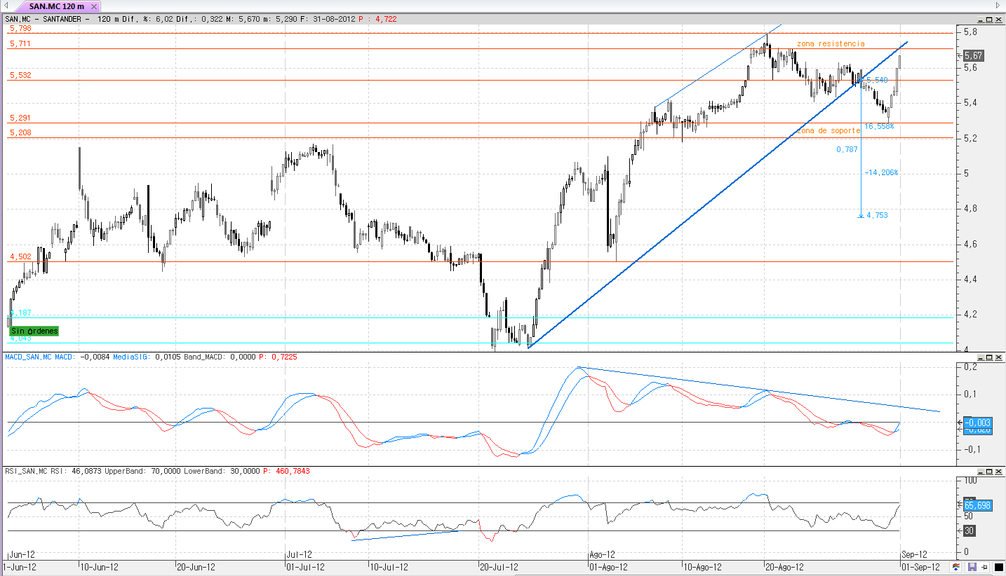 En cuanto al gráfico se puede observar que los indicadores se están relajando, la zona de soporte marcada funcionó perfectamente, la vela realizada en diario es esperanzadora así como el grupo de velas en 120m, todo ello me hace rectificar la línea de tendencia alcista a otra con base en el mínimo de ayer y que pasa hoy por 5.44 aproximadamente; no deberíamos descartar el inicio de un movimiento lateral entre 5.80-5.40.