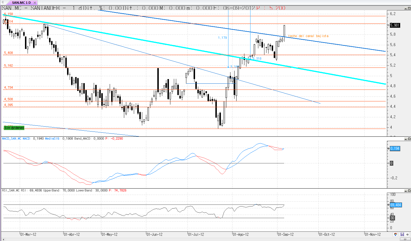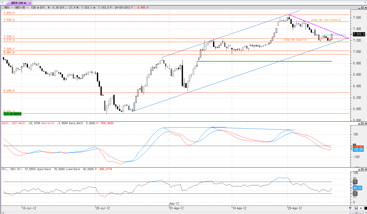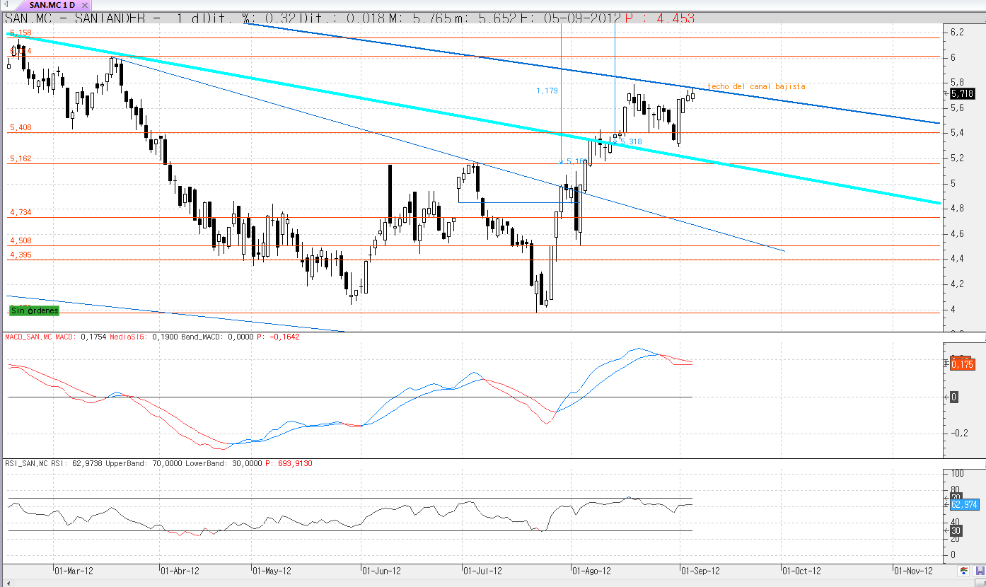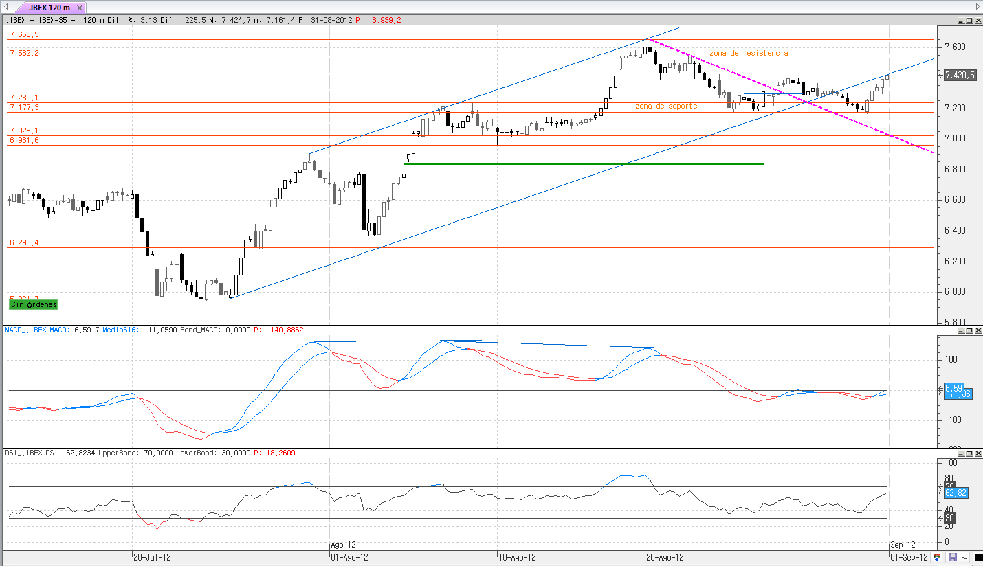 En cuanto al gráfico se puede observar que los indicadores se están relajando, la zona de soporte marcada funcionó perfectamente, la vela realizada en diario es esperanzadora así como el grupo de velas en 120m, todo ello me hace rectificar la línea de tendencia alcista a otra con base en el mínimo de ayer y que pasa hoy por 5.44 aproximadamente; no deberíamos descartar el inicio de un movimiento lateral entre 5.80-5.40.