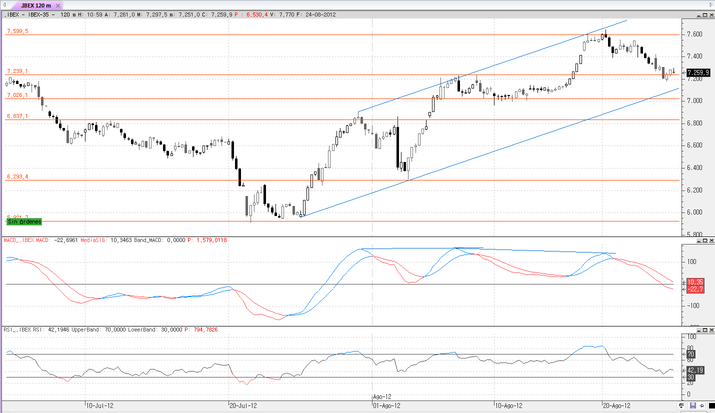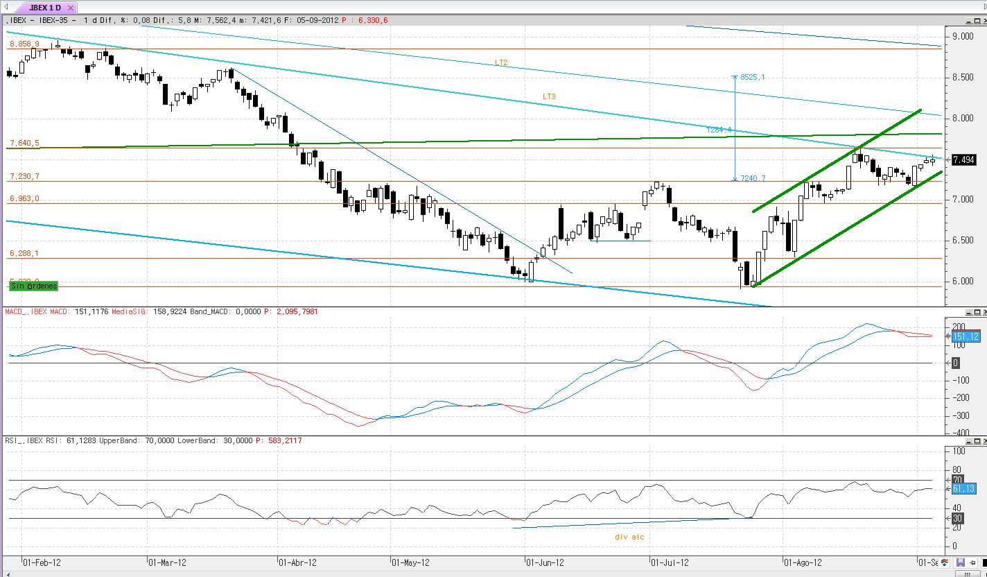 Para hoy veo caídas del IBEX hasta 7300. Pero el 38.2% de corrección de todo el impulso de subida está en 6980.
