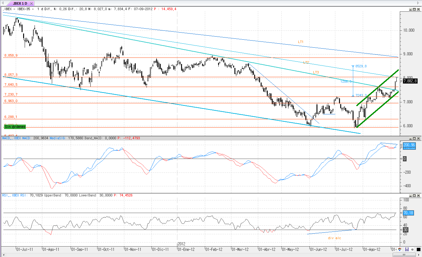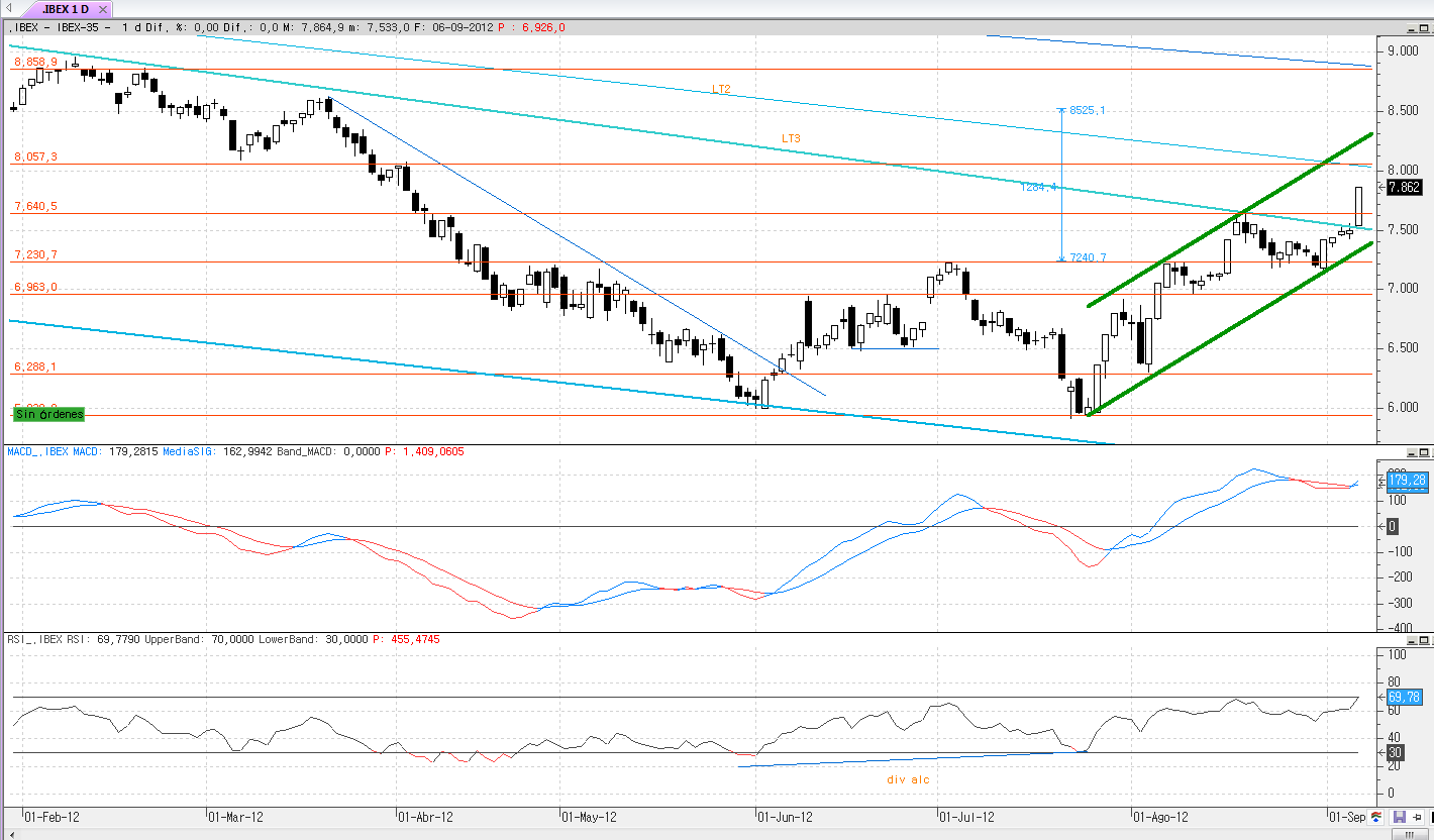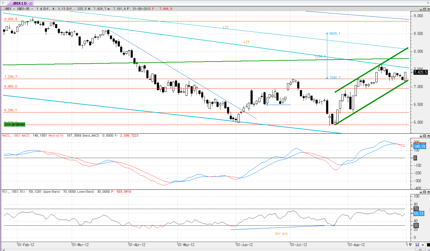 El Ibex, al igual que el san, comprobó soportes y funcionaron, aunque como siempre realizó una de las suyas con la barridita de stops, no descartaríamos que fuera a tocar la base del canal (7115) .