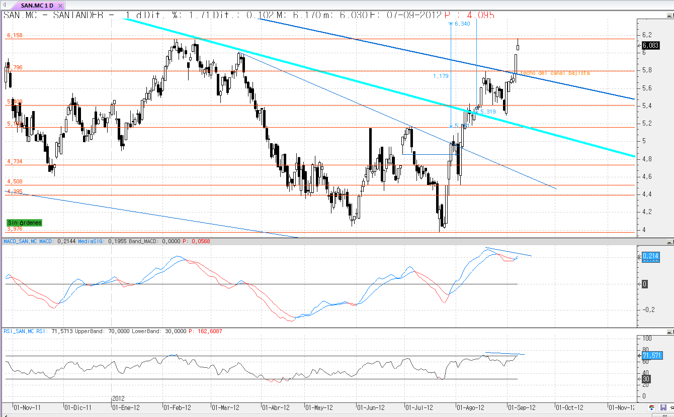 -San: a diferencia del ibex, presenta divergencias bajistas, siempre y cuando el lunes baje. El escenario igual que el ibex, espero retrocesos hacia la zona 5.80, el objetivo de la figura esta muy cerca, 6.34, podría intentar llegar pero me inclino más por los retrocesos. Observaré si el hueco dejado sirve como soporte, sino es así, bajará al 5.80, zona de soporte. La resistencia en el máximo del viernes.