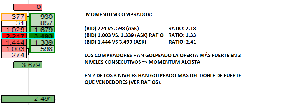 El momentum alcista se produce cuando compradores agresivos golpean rápidamente a los vendedores pasivos (órdenes limitadas) que se encuentran en la oferta (ASK), antes de que los vendedores agresivos puedan golpear con la misma velocidad a los compradores pasivos que se encuentran en la demanda (BID).