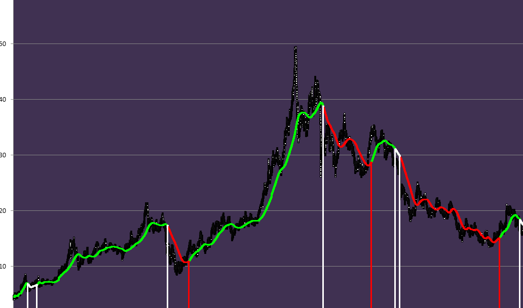 pongo unos ejemplos de activos reales, las líneas verdes son fondo alcista, las líneas blanca se mantiene el fondo alcista pero con neutralidad a cambio de sesgo, y las líneas rojas es sesgo bajista fuerte. Son 4 parámetros y 2 alisados, para todos iguales, toda clase de activos.