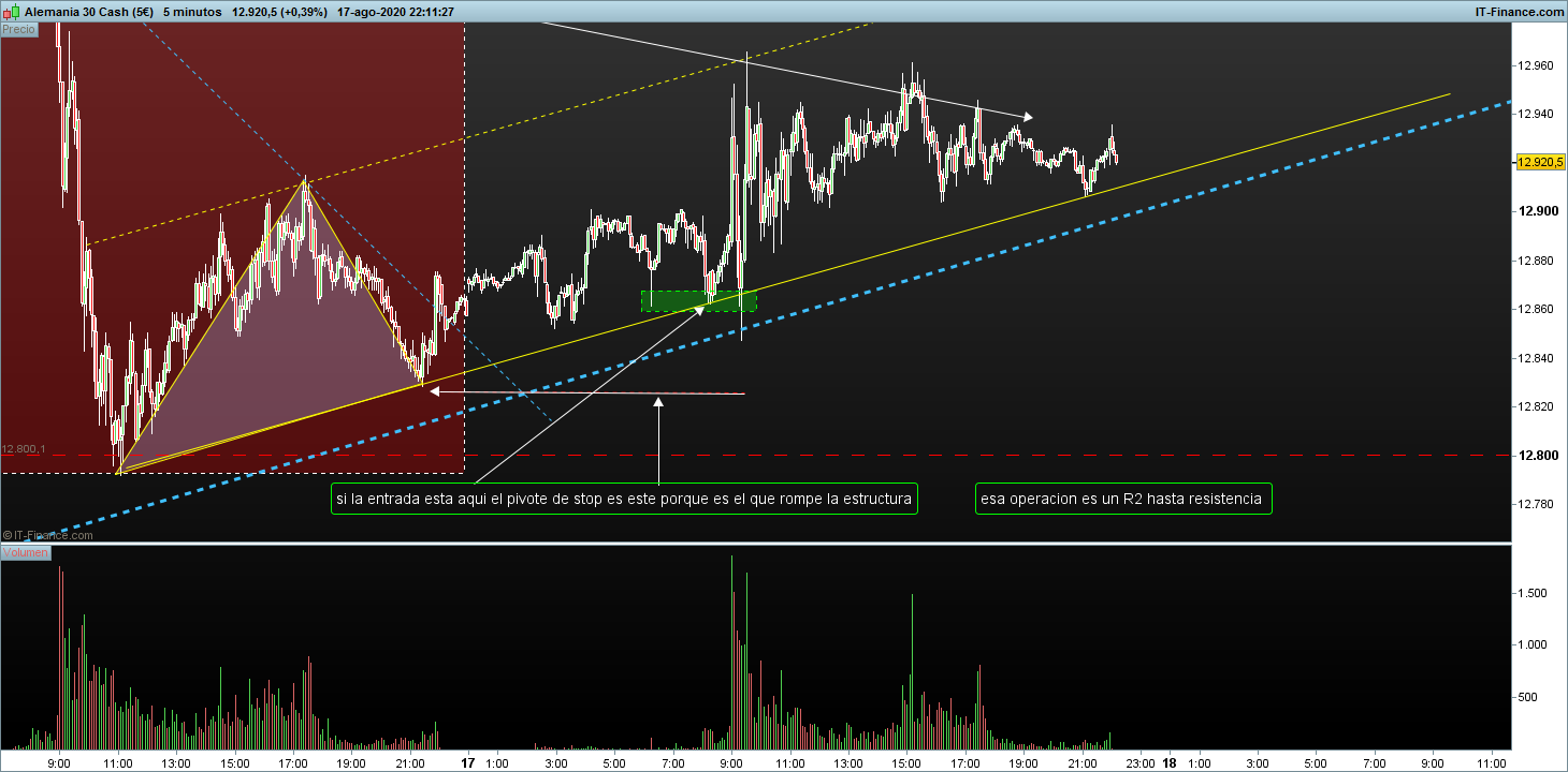 ayer el canal amarillo intradia la linea de techo es clonada de la linea base que arranca con dos pivotes en ese patron de arranque ( triangulo), se aprecia como cumple en volatilidad