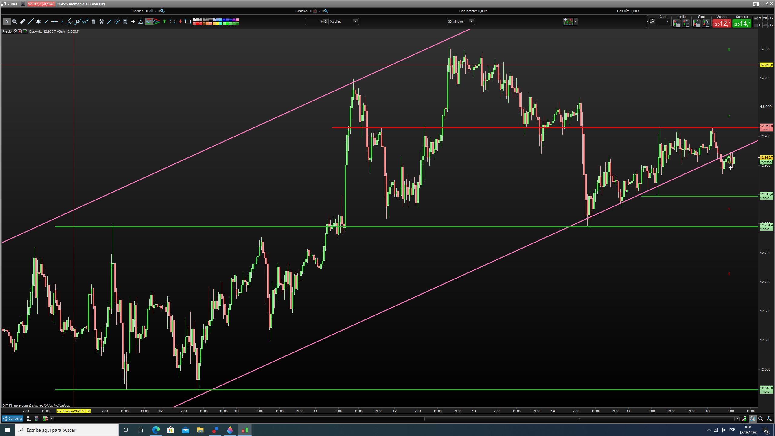 Hoy no hay configuracion de rango y el soporte ya es historia, esta muy lejos, la pauta de hoy es tendencia en 30m y en la base del canal de 30m dio una entrada en 12863 apx,practicamente en zona de minimos de lo que lleva de sesion pero hay que tener en cuenta la bajista que arranca desde el jueves que ya la testeo hoy en la apertura de 9 a 9,30, mas tarde 2 testeos mas , ahora mismo el ultimo