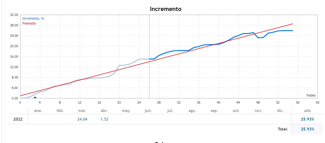 Estado actual de la cuenta pues este mes solo logre un 1.5 %, talvez no este mal, pero la caída de la cuenta fue importante, ( riesgos que se toman, entre mas grande la cuenta menos riesgos se deben tomar, entonces estamos dentro de lo permitido) tenemos un 26%, vamos a ver como marcha el siguiente mes; por otro lado les comento he terminado el bot , estoy tratando de ajustar los mejores parámetros y conseguir algo de capital para invertirle, es prometedor, la idea con el bot es igualmente doblar la cuenta en un año o algo mas, , en unos días , si consigo inversores lo pongo a correr o cuando tenga alguna novedad, saludos a todos