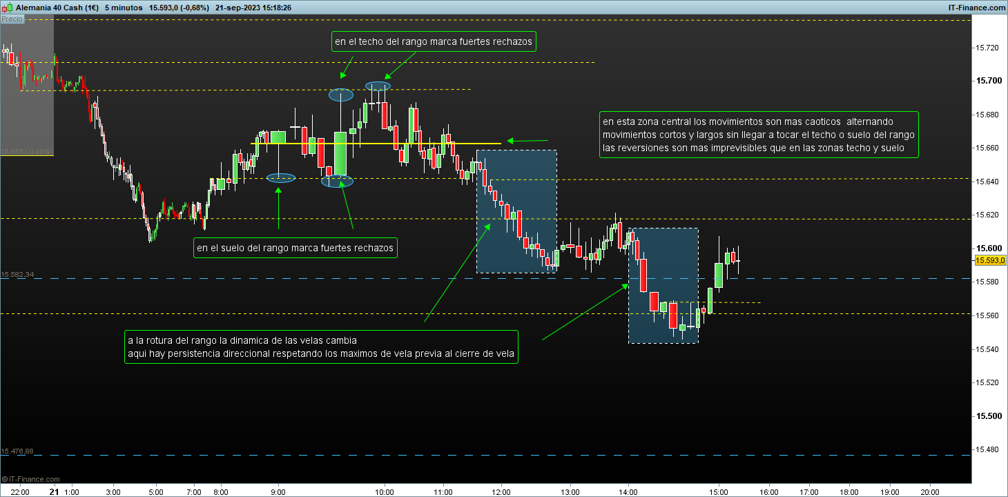 En la zona central de un rango relativamente estrecho, todo esto no se cumple, en esa zona se generan velas largas en las dos direcciones que llegan a tocar o se aproximan a las zonas de techo o suelo del rango, el mercado ahi es mas eficiente direccionalmente en el sentido que es mucho mas dificil que de sen velas de continuacion de rango medio, o son velas barriendo desde sus maximos o minimos o son velas de rotura o son velas con alternancia direccional, la alternancia direccional de las velas en la zona central del rango es mas alta que en el techo o suelo del rango