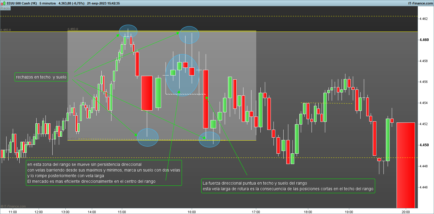 Eficiencia direccional en este contexto se refiere a las pistas que da el precio en el centro del rango respecto a las zonas de techo y suelo del mismo rango donde las pistas que marca son mas evidentes.