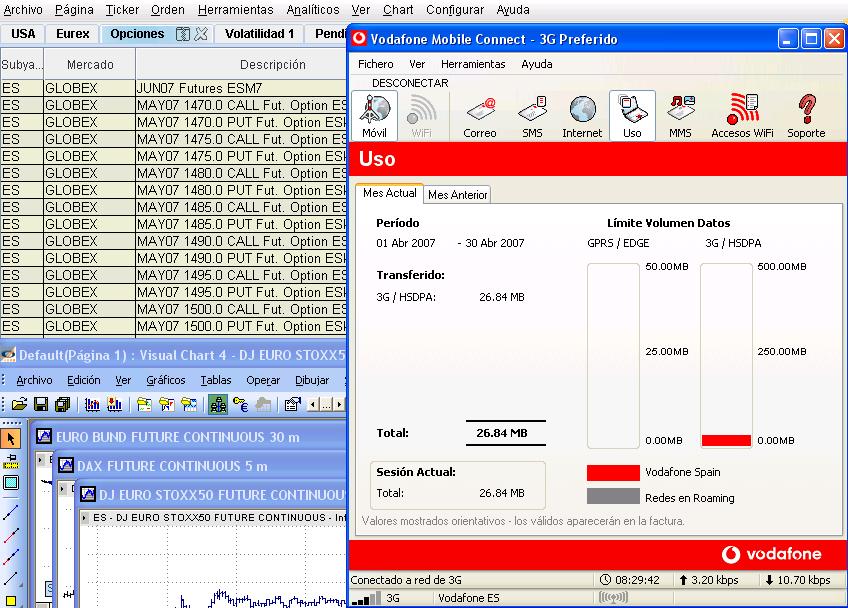 Con motivo de tu pregunta lo he conectado esta mañana y le he metido Visual Chart con los tres futuros y la TWS con los minis, los Eurex y todo ese chorizo de opciones además de otras tantas en la pagina de volatilidad.