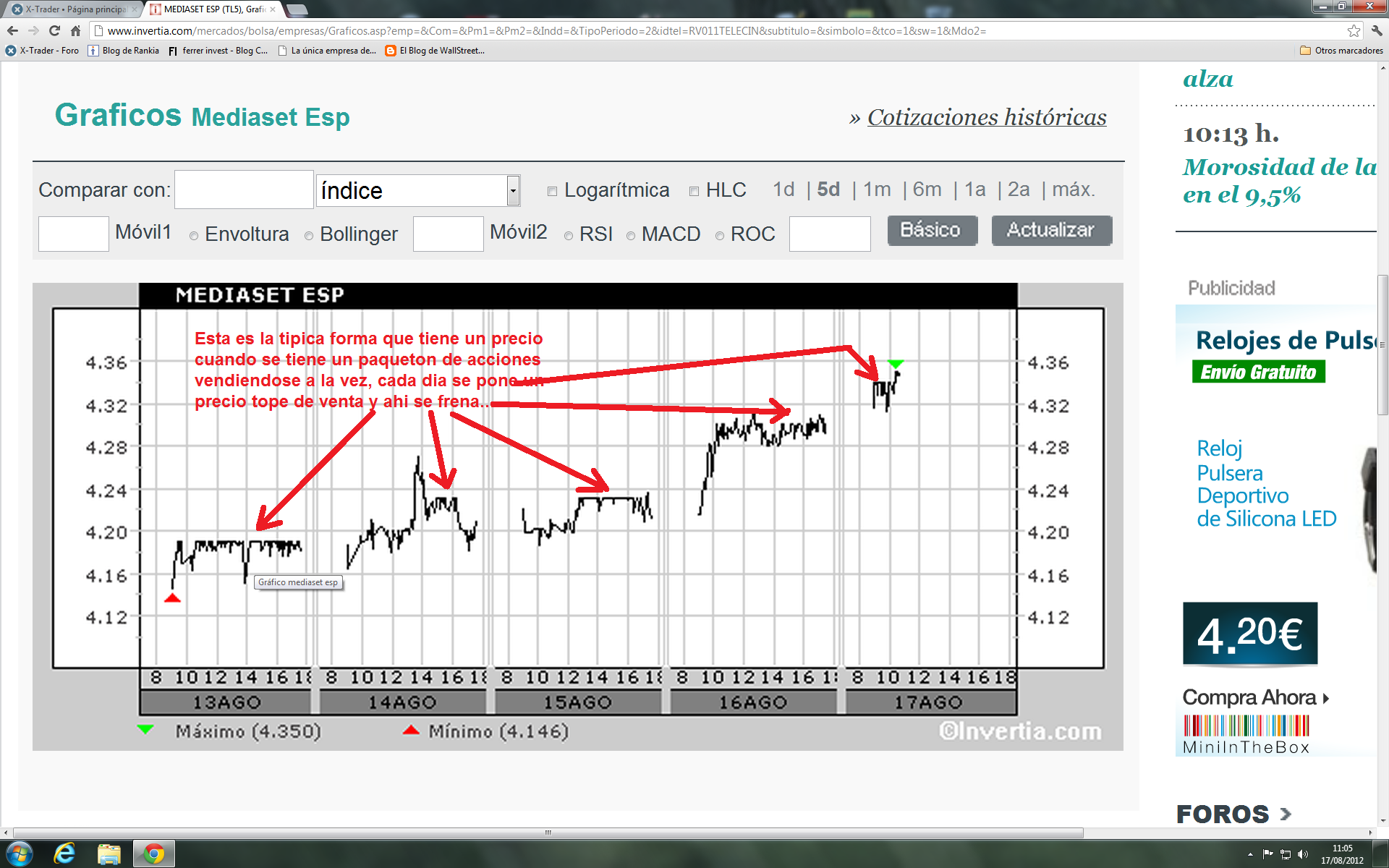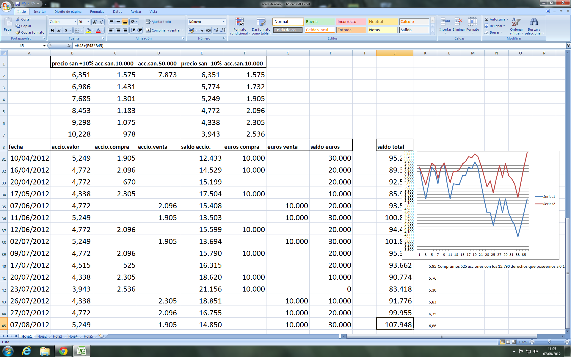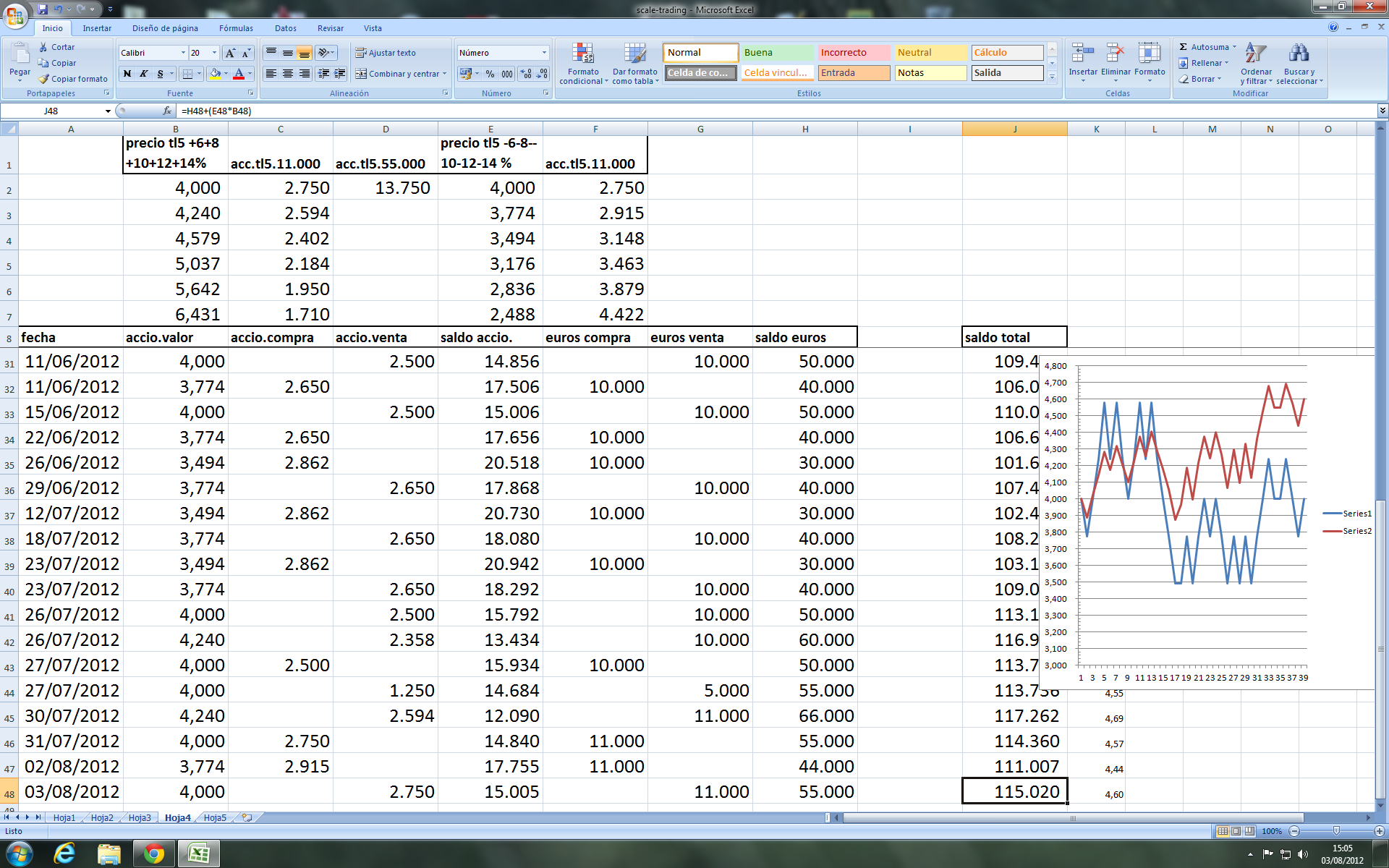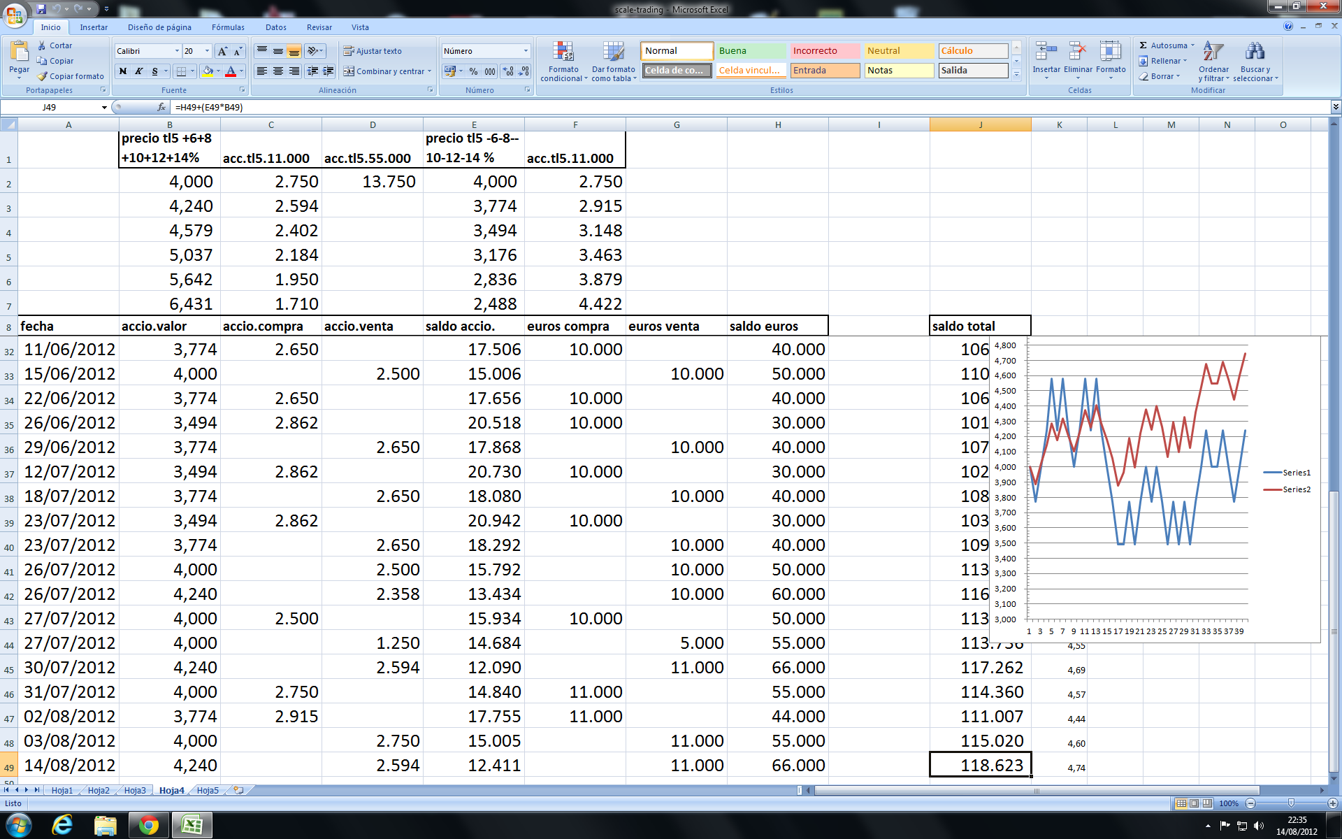 Bien, despues de unos dias de asueto, veo que tengo frentes abiertos por contestar, primero pondre como nos va la estrategia en tl5, que ayer volvio a tocar los 4,24 euros y tuve que vender acciones por valor de 11.000 euros.