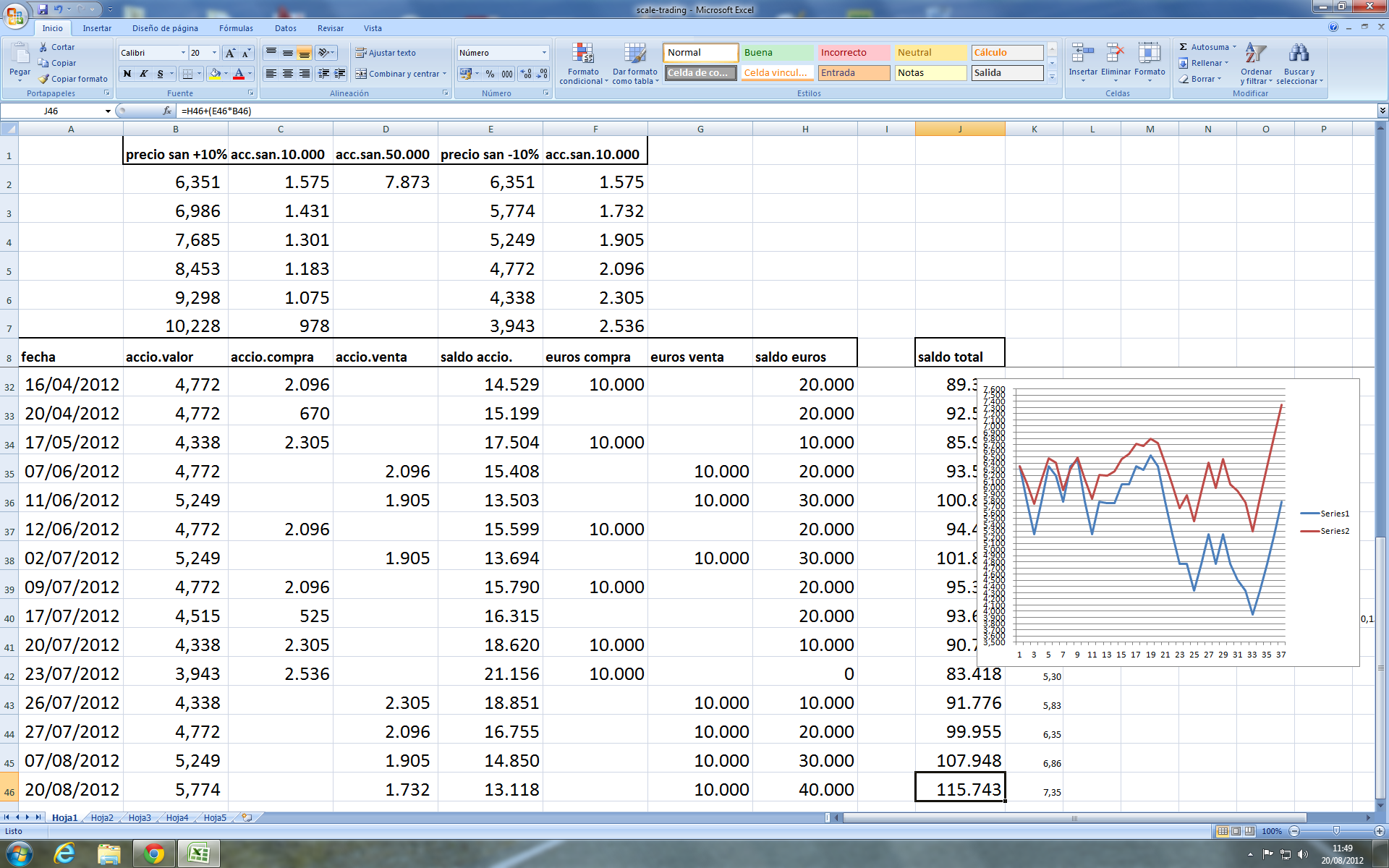 En vez de utilizar todo el capital (100.000 euros), en la estrategia, podria utilizar solo una fraccion de ese capital, y solo trabajar con las diferencias de subidas y bajadas... el resultado a nivel de beneficio liquido seria el mismo, pero no asi el beneficio porcentual (que seria mayor), puesto que el capital con el que se trabajaria seria menor e incluso los escalones por abajo serian mas numerosos...