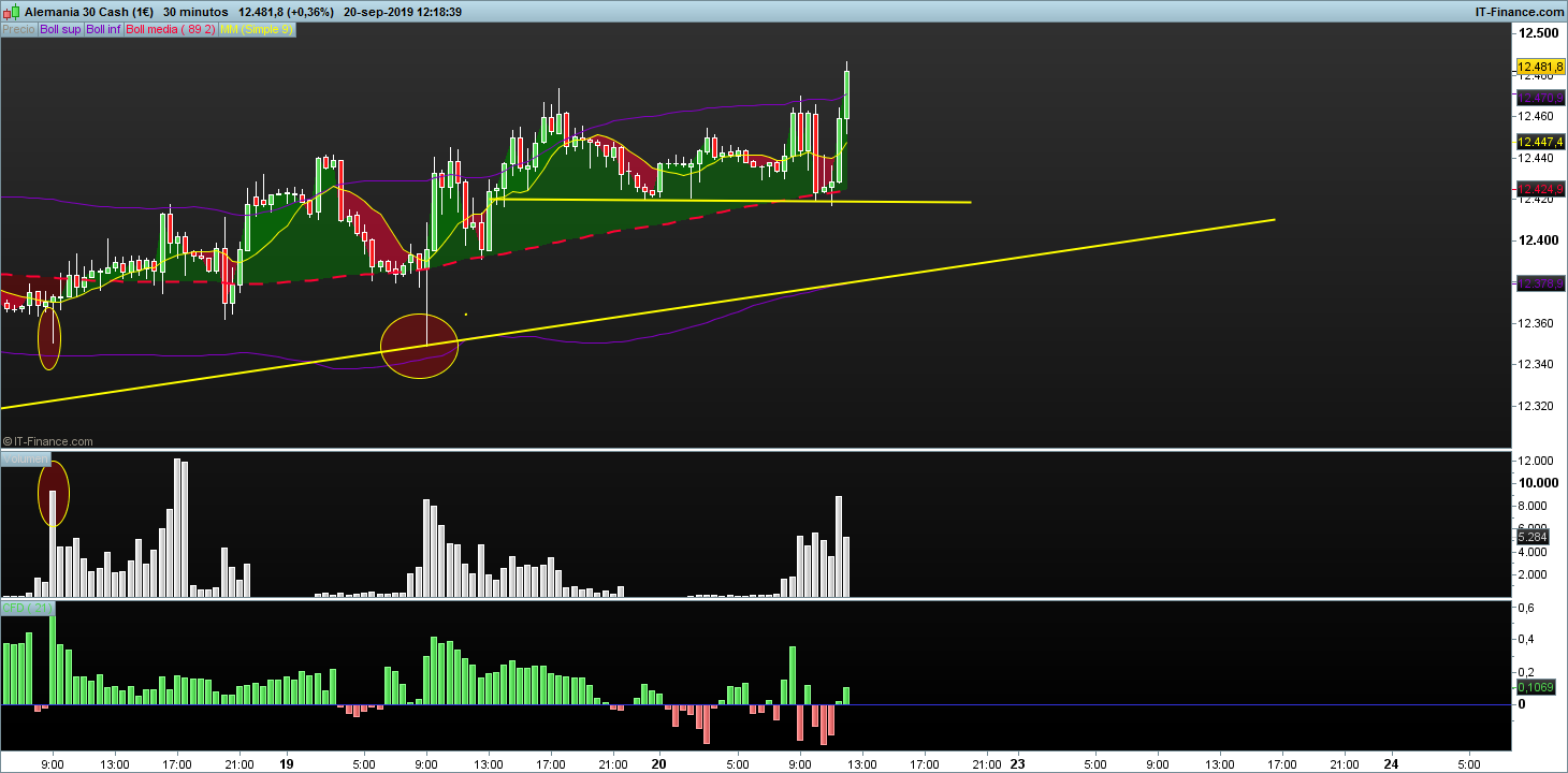 La vela que toca mínimos en 12302 a las 14,30, es una vela de absorción con volumen alto que mete al precio sobre el pivote