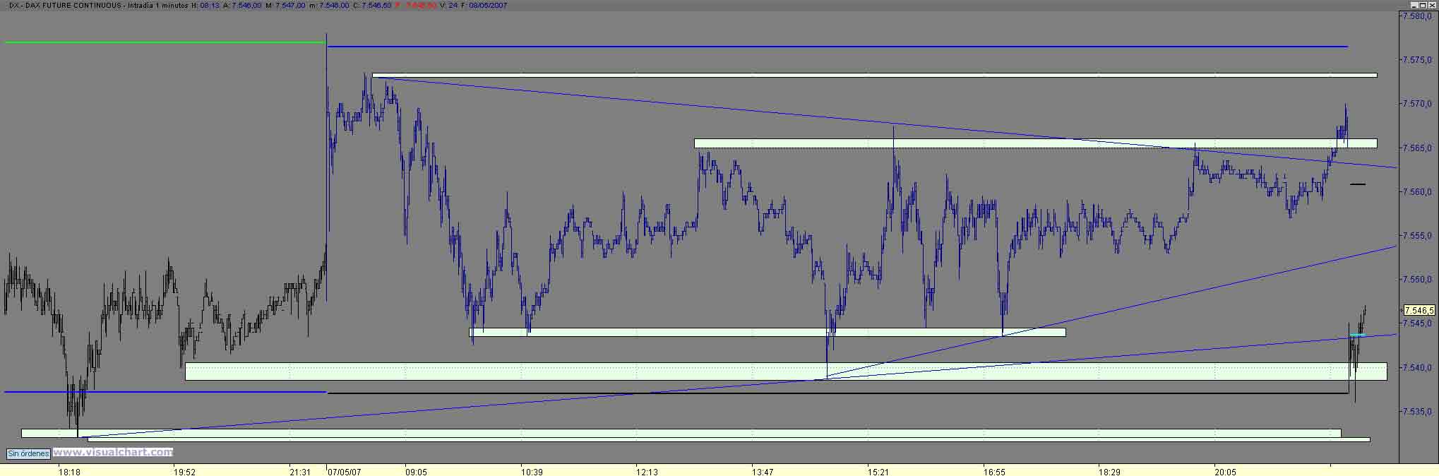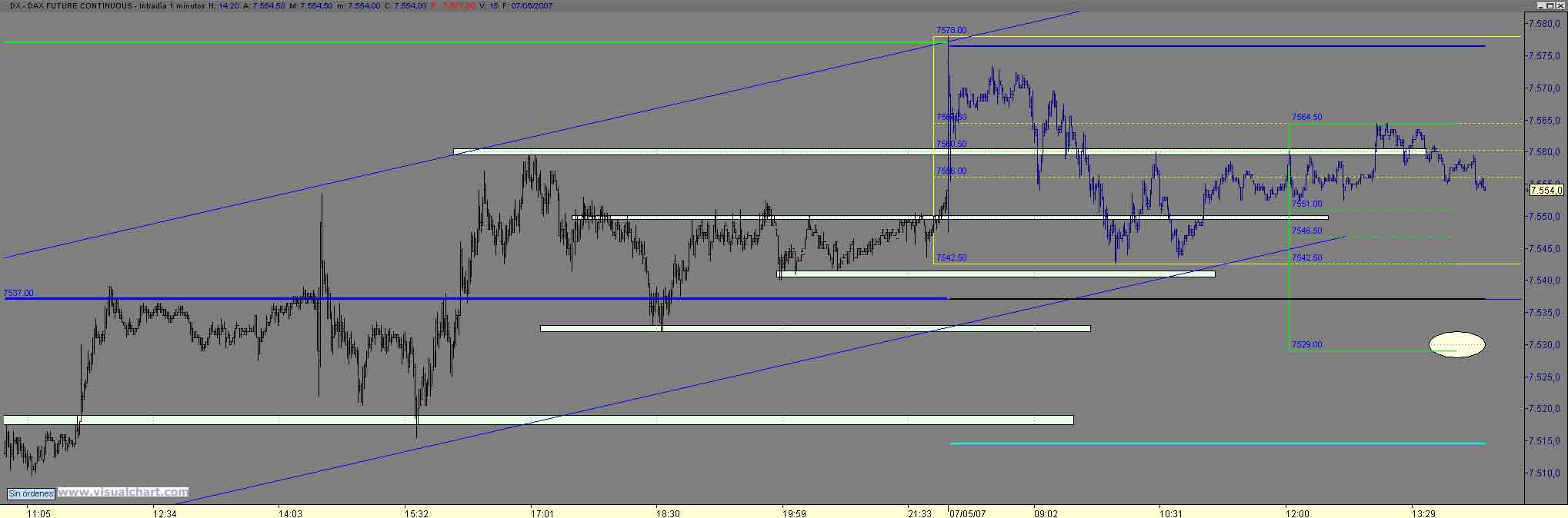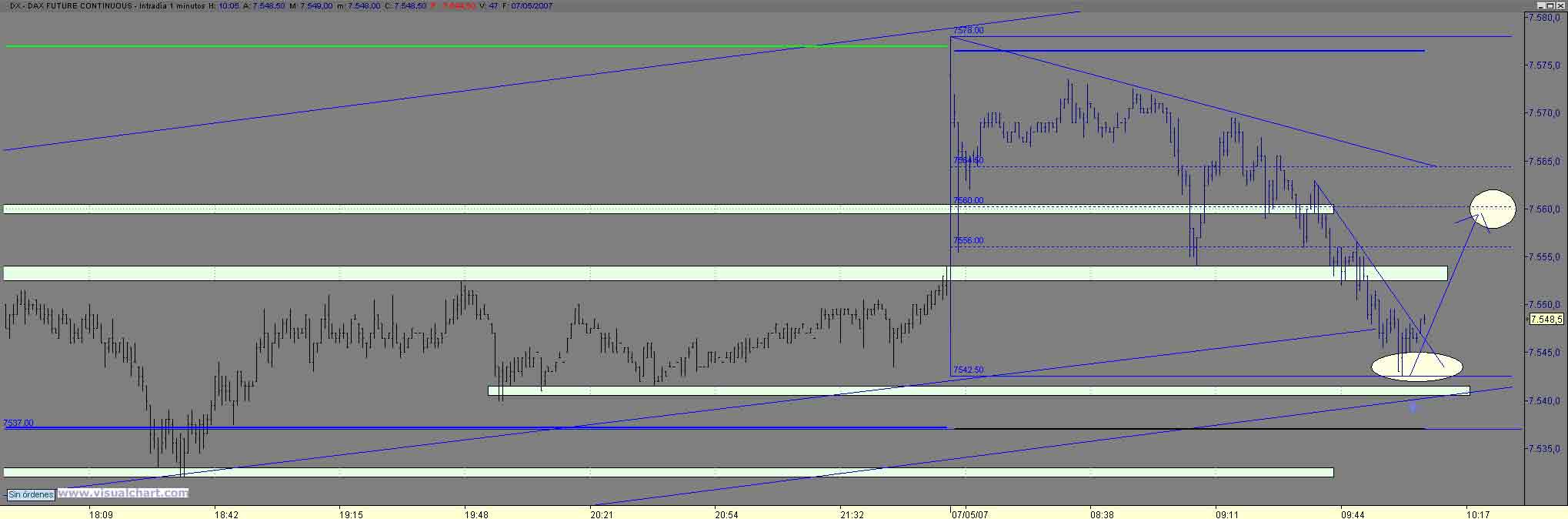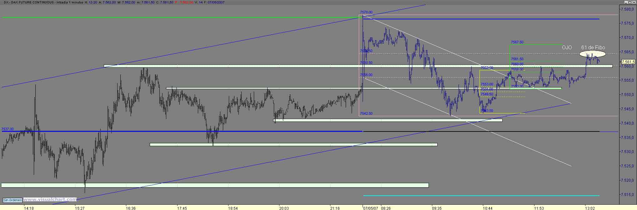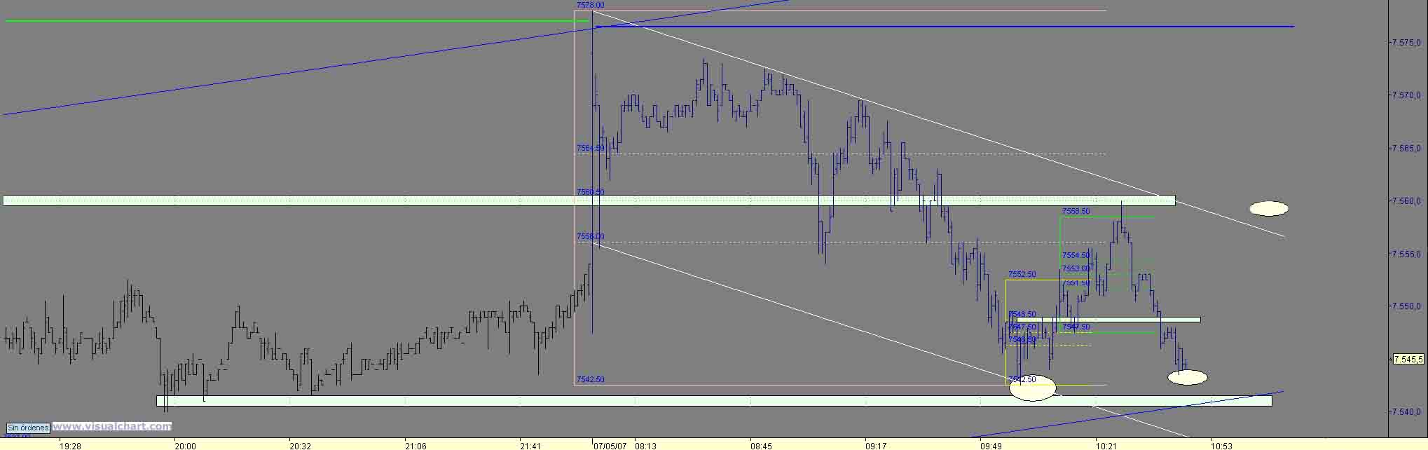 Mañanita de vaivenes la apertura de Europa hizo que el precio se descolgara hasta el nivel de 30 siguiente nivel de control para volver al que ayer fue nivel de soporte matinal el 7552 no pudo con el y caida en tres impulsos hasta el nivel del 7503 (61 de Fibo de toda la subida desde 7457.50) esa zona 7500 7523 es la zona que no deberia perder para tratar de ir de nuevo al 60 de momento ha dado opcion a un par de largos con recorrido hasta el nivel del 22 24 coincidente con el nivel de R2 de pivot y 50% de recuperacion de la caida de hoy se producen divergencias (3) en graf de 5m Un saludo