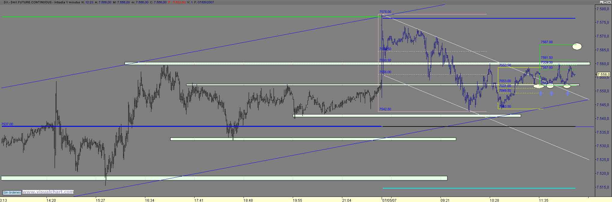 Muy  buenos dias vaya apertura que hemos tenido hoy en nuestro amigo en la primera barra de 1m se ha meneao 30 puntos ahi es na a la 8 de la mañana  y lo ha echo entre el cierre del viernes y el nivel del R1 de pivot 7576 desde ahi hasta la apertura de europa ha vuelto al nivel de de cierre del viernes y zona de control 7556 por debajo tenemos el pivot  7537 y la zona de control del 7532  ojo por que seguimos en el canalillo  desde el 7460 asique esa es la guia y mientras no se pierda pues esta claro que las vueltas a puntos de control  son zonas de largos , hasta donde?? eso no sabemos pero  para mi hasta el nivel del 7520  7500 ( que es el 50 y 61 de Fibo del movt desde el 7457 ) es el nivel a respetar Un Saludo
