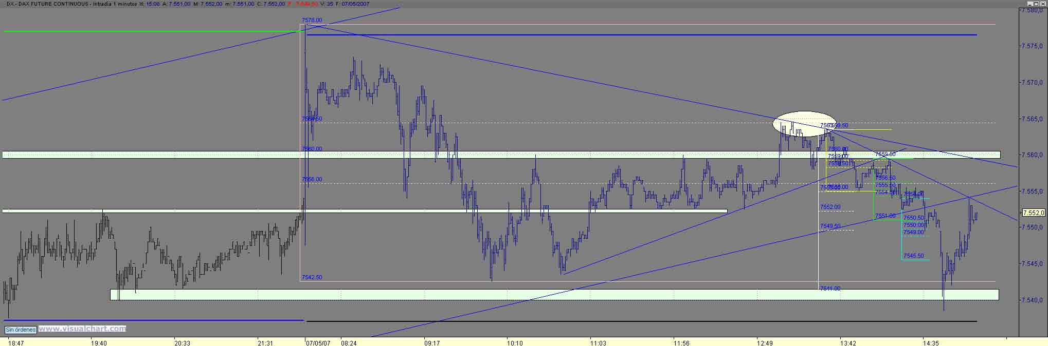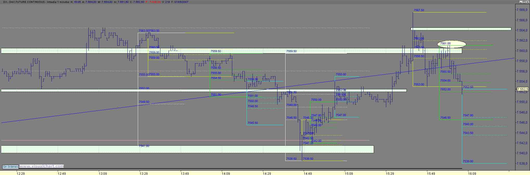 Mañanita de vaivenes  la apertura de Europa hizo que el precio se descolgara hasta el nivel de 30 siguiente nivel de control para volver al que ayer fue nivel de soporte matinal el 7552 no pudo con el y caida en tres impulsos hasta el nivel del 7503  (61 de Fibo de toda la subida desde 7457.50) esa zona 7500 7523 es la zona que no deberia perder para tratar de ir de nuevo al 60 de momento ha dado opcion a un par de largos con recorrido hasta el nivel del 22 24 coincidente con el nivel de R2 de pivot  y 50% de recuperacion de la caida de hoy se producen divergencias (3) en graf de 5m Un saludo