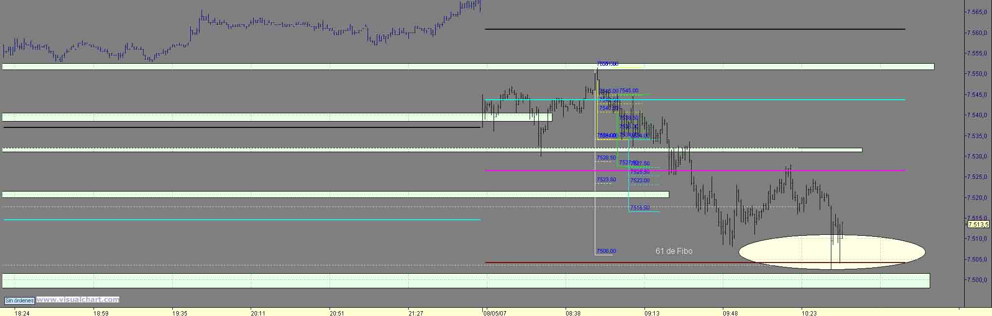Perece que ese 61% de Fibo de todo el movt de hoy  fue el punto de arranque del cambio de sentido, aunque el impulso da como obj el 29 30 antes de ahi tambien hay vida y como en formacion de  3  impulsos hasta volver al lugar del crimen matinal 7540 42  donde moentaneamente volvemos a ir hacia arriba ( pero ojo mientras no superemos ese 7564.50  seguires pensando que iremos al 29 30  como?? eso en breve lo veremos  de momento toca esperar pues esos posibles largos en la zona del 40 42  fueron a su nivel natural inicial que es el  52 53  nivel de soporte matinal que fue roto Un Saludo