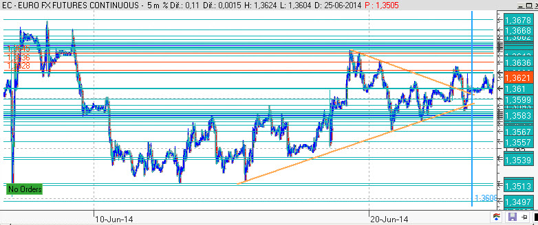 Está delicadito. Hace dos o tres días que ví unos niveles de prueba que ya comenté, son las líneas rojas en el gráfico, y el primero es 1,3628, que pensé intentaría antesdeayer y probó ayer sin éxito. Los siguientes hacia arriba, aunque cercanos pueden provocar también caidas en cascada al probarlos, aunque siempre peude haber convicciones de manos fuertes o aprovechamientos de oportunistas con suficiente mano fuerte, para barrer unos stops, etc.