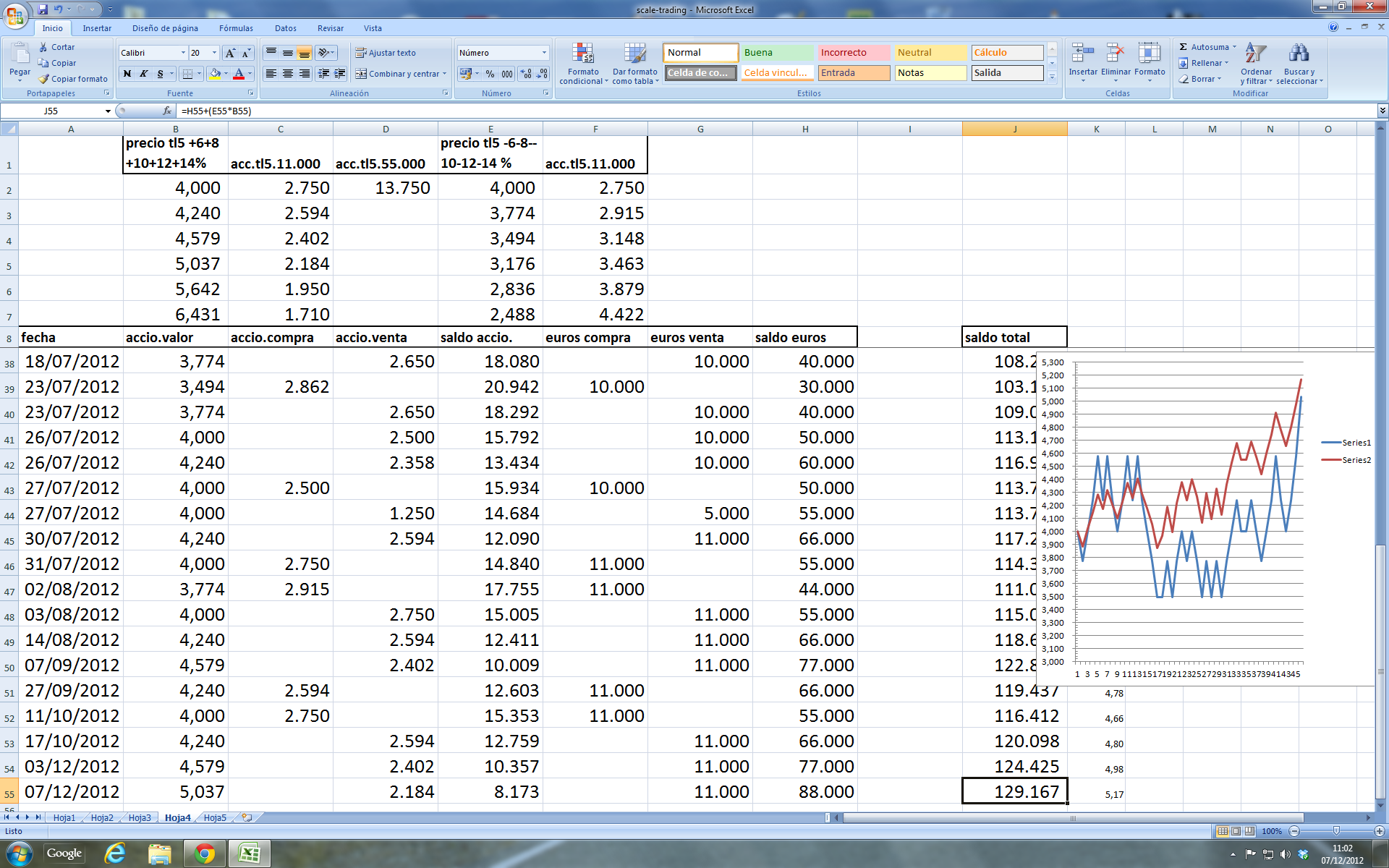 Bien, con tl5 yo he hecho como si tuviera un contrario correlacionado perfectamente negativo y he hecho un grafico... aparecen las dos cotizaciones, la de tl5 y la de su contrario, y sobretodo aparecen los resultados de la estrategia aplicados a las dos cotizaciones...