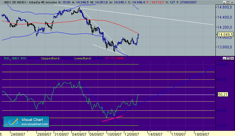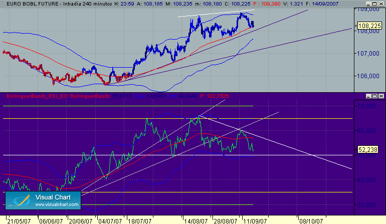 En el Bol tenemos un doble techo con dos maximos irregulares, fuerte resistencia en los entornos del 109, formacion de divergencia en RSI con buen patron,actualmente apoyado en la directriz alcista que arranca de minimos en precio, la proximidad de la banda 50 Rsi aumenta las probabilidades de que baje apoyarse en ella.
