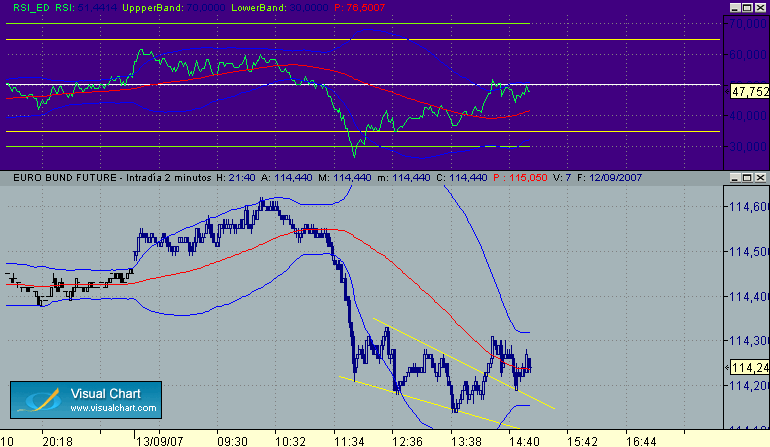 En el Bund tenemos una formacion en cuña acompañada por decrecimiento del volumen , una fuerte resistencia en los niveles de 114.60 , la principal directriz bajista y la banda bollinger superior, actualmente apoyado en la directriz alcista y base de la cuña y soporte menor en precio apx en 114.