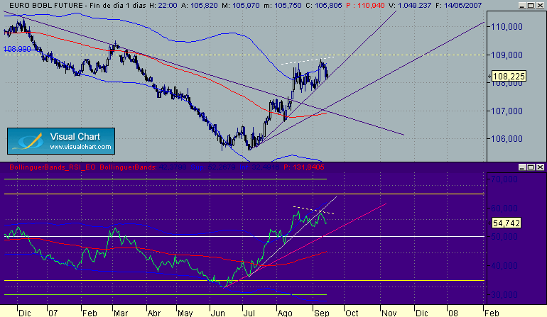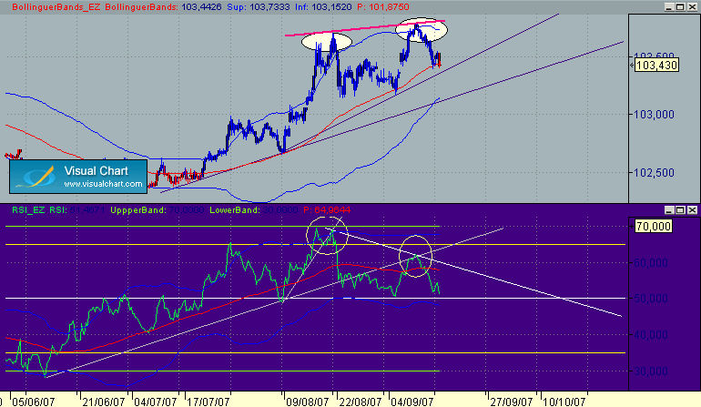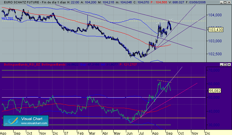 En el schatz tenemos el mismo patron que en el Bol con mas precision al tocar la directriz bajista y la fuerte rersistencia en 103.76, divergencia en Rsi formando buen patron y proximidad de su banda 50.