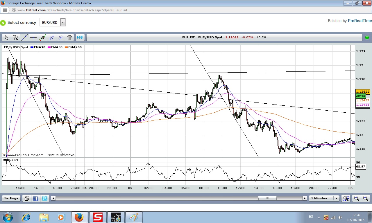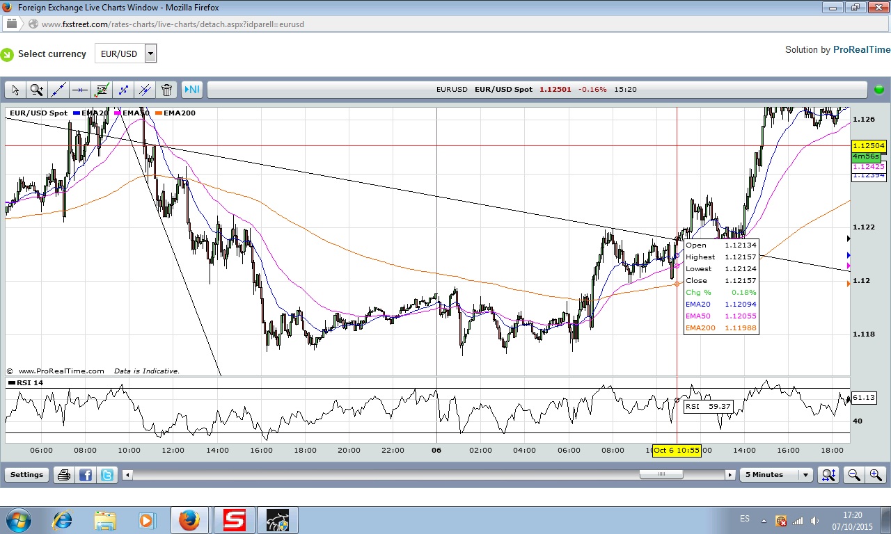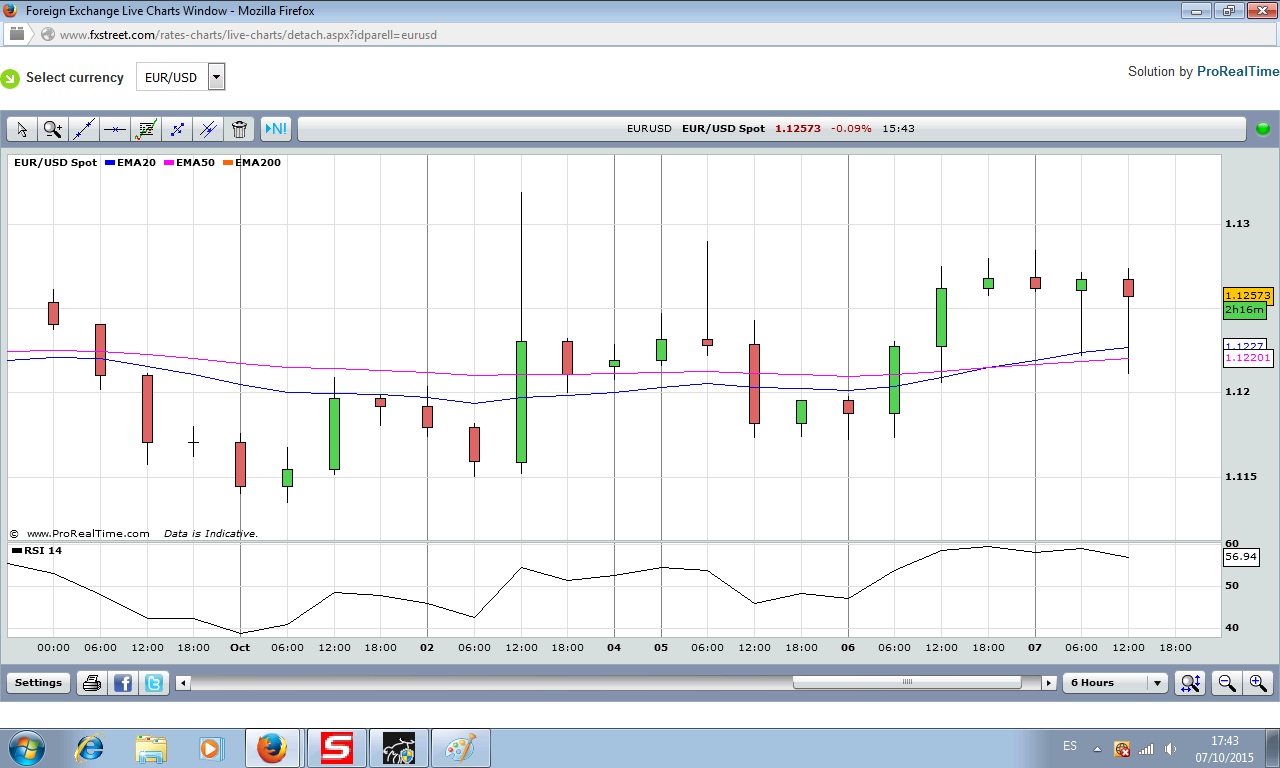 Tras el mínimo que predije en 1.117 (lo puse en negrita y todo), vienen dos velas verdes largas en 6h, las ves? Bien, La segunda corrije hasta el 1.1206 "siendo esta cota MÁS del 50% del recorrido de la vela anterior (1ª condición) y siendo a su vez superada, tanto en sombra como en cierre, por la vela siguiente." Cuando se dan tales condiciones, solo cuando se dan las dos, una perforación del 1.1206 implica una caida más allá del mínimo marcado (incluida la sombra) por la vela precedente, esto es, nos iríamos al 1.1173.