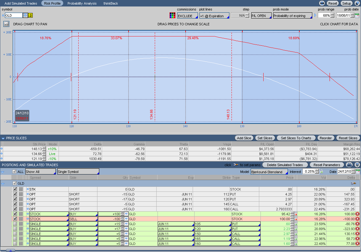 Hoy vamos a hacer un pequeño ajuste, ya que el oro parece estar haciendo máximos temporalmente, como el mercado esta cerrado y no voy a poder estar luego, he vendido 300 stocks del GLD por 134,2, así dejo la Delta un poco negativa (-30), mi intención es re-comprar estas 300 acciones sobre 128-130, pero ya veremos...