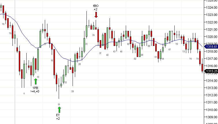 Alambre de púas (BW) temprano en el día, como podemos ver cerca de la vela 6, es muchas veces una señal de TTRs y tendencias suaves, y se deben tomar operaciones con mucho cuidado. Una vez que el TTR ha concluido la tendencia, la siguiente acción es esperar un rompimiento de la tendencia, como triángulos expansivos o retracción de rompimiento (DP). Cualquier movimiento de dos segmentos puede ser operado si el rango es suficientemente amplio. Hoy el rango fue apenas de 5 o 6 puntos, por lo que arriesgarías cerca de dos puntos para lograr esencialmente 2 puntos o menos. Normalmente es mejor evitar operar en estas condiciones.