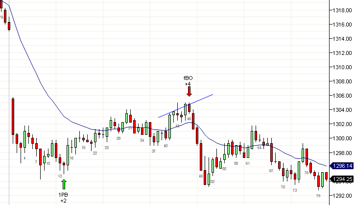 Un primer intento puede tomarse si la vela de señal está muy bien formada, como una vela de reversa en un sobretiro. Y si no, es muy posible que un primer intento mal formado te toque el stop. Un vistazo rápido a la acción de este día ilustrará la importancia de tomar solamente velas de señal bien formadas. Los cortos debajo de las velas 16, 20, 24 y 27, todos fallaron porque eran esencialmente dojis. Los cortos debajo de las velas 31, 46 y 63 resultaron mucho mejores, ya que eran velas de tendencia. Velas de menor calidad son tolerables durante la primera hora y en segundos intentos, como se ilustra con las velas 14 y 73.